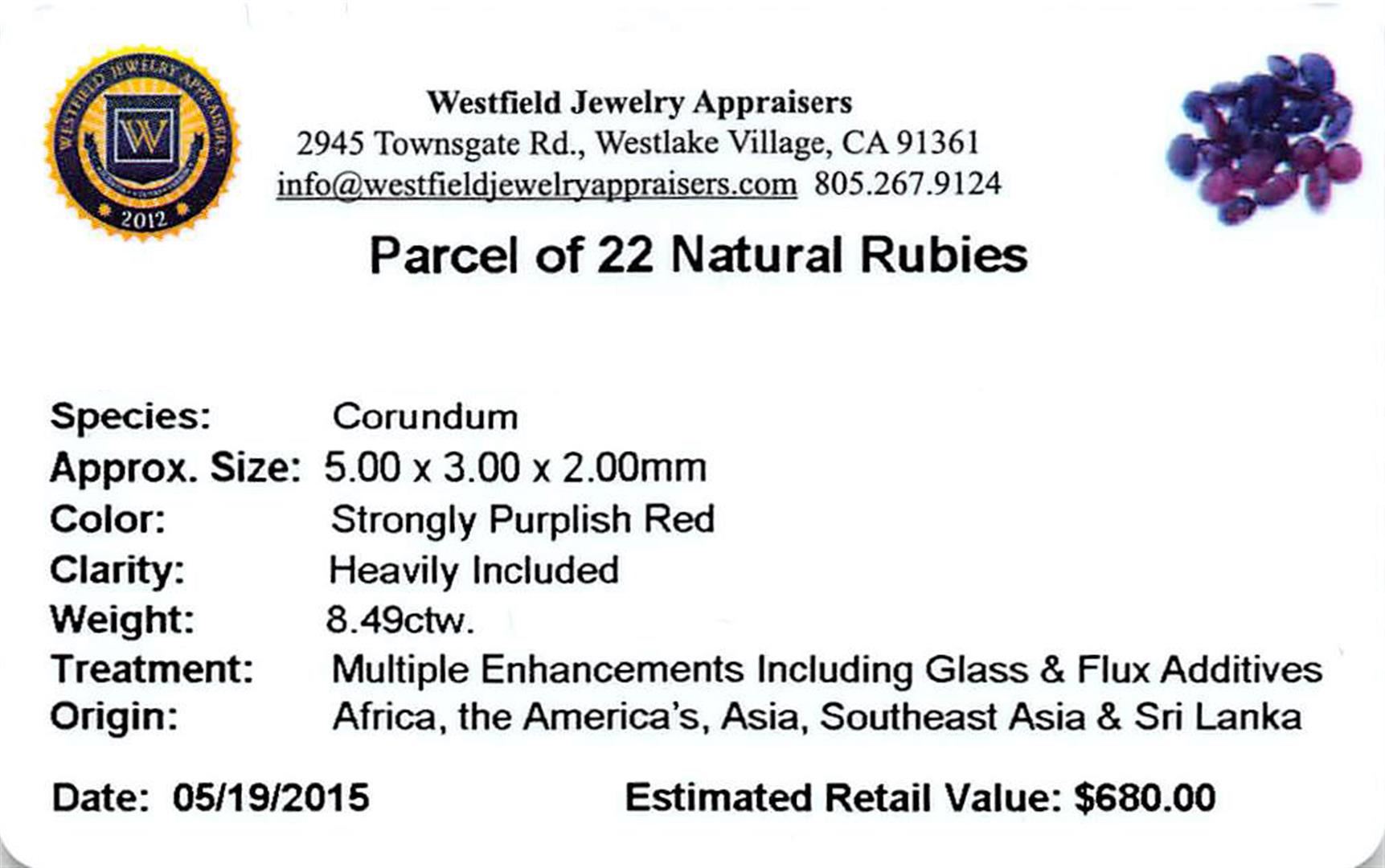 Twenty-two various shapes & sizes cut natural rubies, measuring 5.00 x 3.00 x 2.00mm, exact total weight 8.49ct., clarity is heavily included, type II, very dark, very slightly brownish, strongly purplish red color, (GIA stpR 8/3), cut is good. Measurements are an average for the group. Transmitting light somewhat diffusely, transparent to translucent. Naturally occurring internal & external characteristics are present. Indications of laboratory high temperature heat treatment, with glass & flux additives. Ruby has a low tolerance to rhodium plating, repolishing the surface, & ultrasonic cleaning. Westfield Appraised at $680.00.