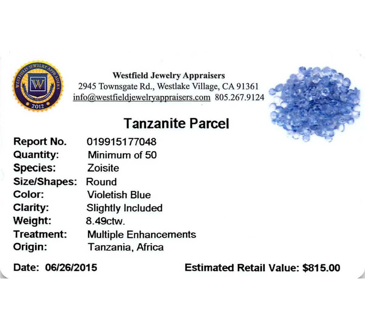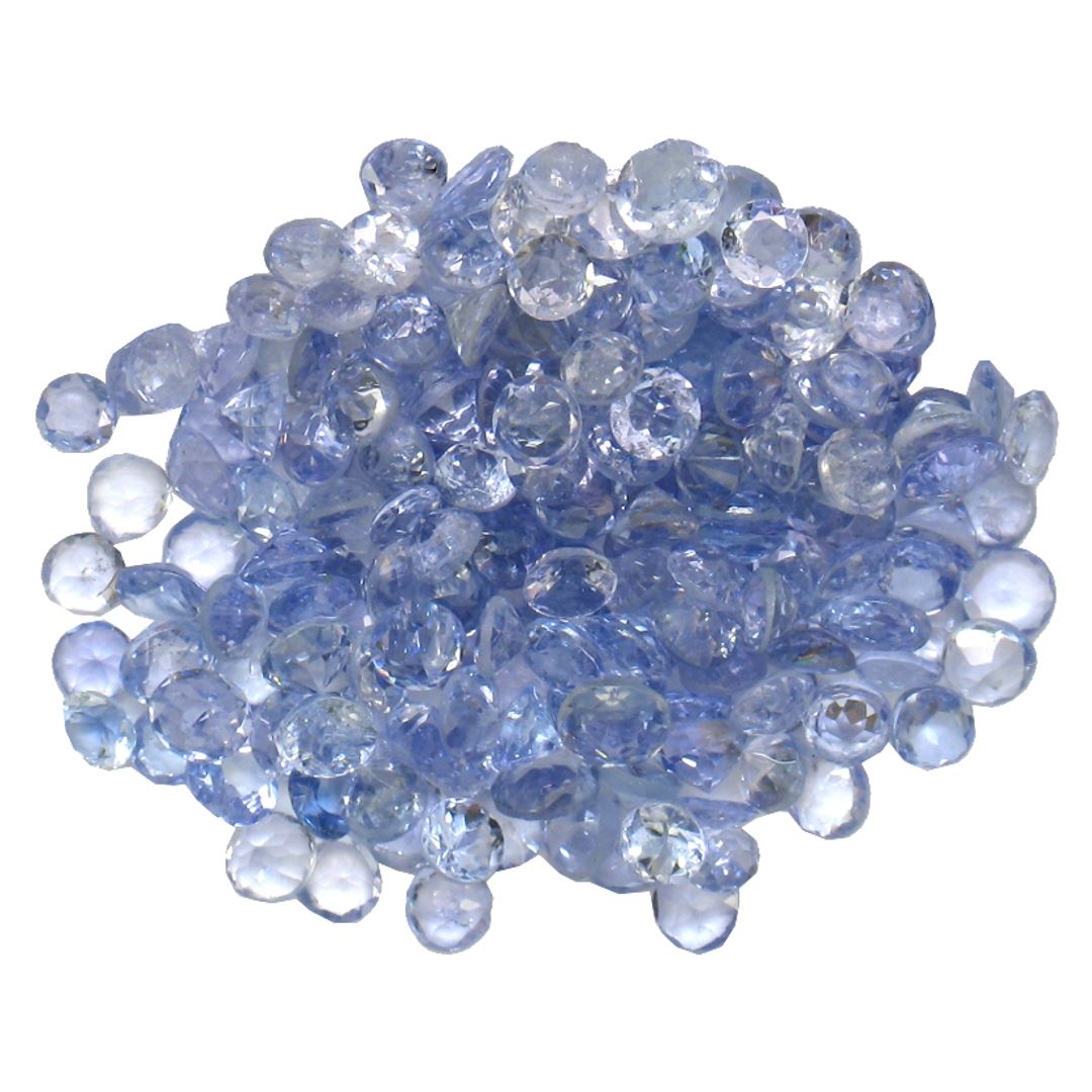 Fifty round mixed cut natural tanzanites, measuring 2.00 - 2.00 x 1.30 mm, exact total weight 8.49ct., clarity is slightly included, type I, medium, very slightly grayish, violetish blue color, (GIA vB 5/3), cut is good. Measurements & the color grade are an average for the group, Color grade is an average for the group, Transmitting light with no distortion, transparent, Naturally occurring internal & external characteristics are present, Indications of multiple laboratory enhancements, including high temperature heat treatment. Westfield Appraised at $815.00.