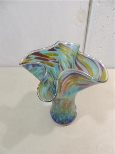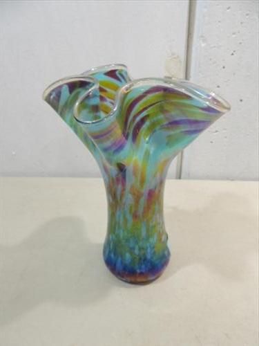 8.5"H HAND BLOWN GLASS EYE STUDIO ART GLASS VASE: RUFFLED TOP. MAKER MARK & TAGS. AS SHOWN. VIEW PICTURE FOR DETAIL.