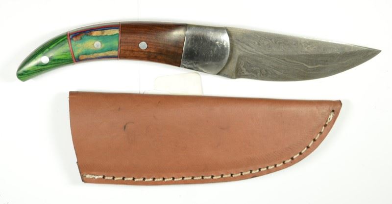 8.5 Inch Ladder Pattern Genuine Top Grade Damascus Steel Hunting Knife/Skinner with a Walnut Wood and Exotic Colored Wood Handle. 4" blade, 4.5" handle, Genuine Leather Sheath (Designed as a Ladies Knife) EST:$150-$200