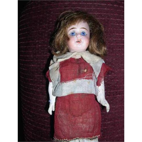 8.5" Tall 7/0 Bisque Doll. Doll has open mouth with teeth. She has set blue glass eye. She has the crude paper mache body with white ribbed socks. She has on an old dress and pantaloons. The dress is worn in places. The wig is old. Doll comes from a smoke free environment. Buyer to pay $10 for shipping, handling, and insurance. Thanks for viewing.