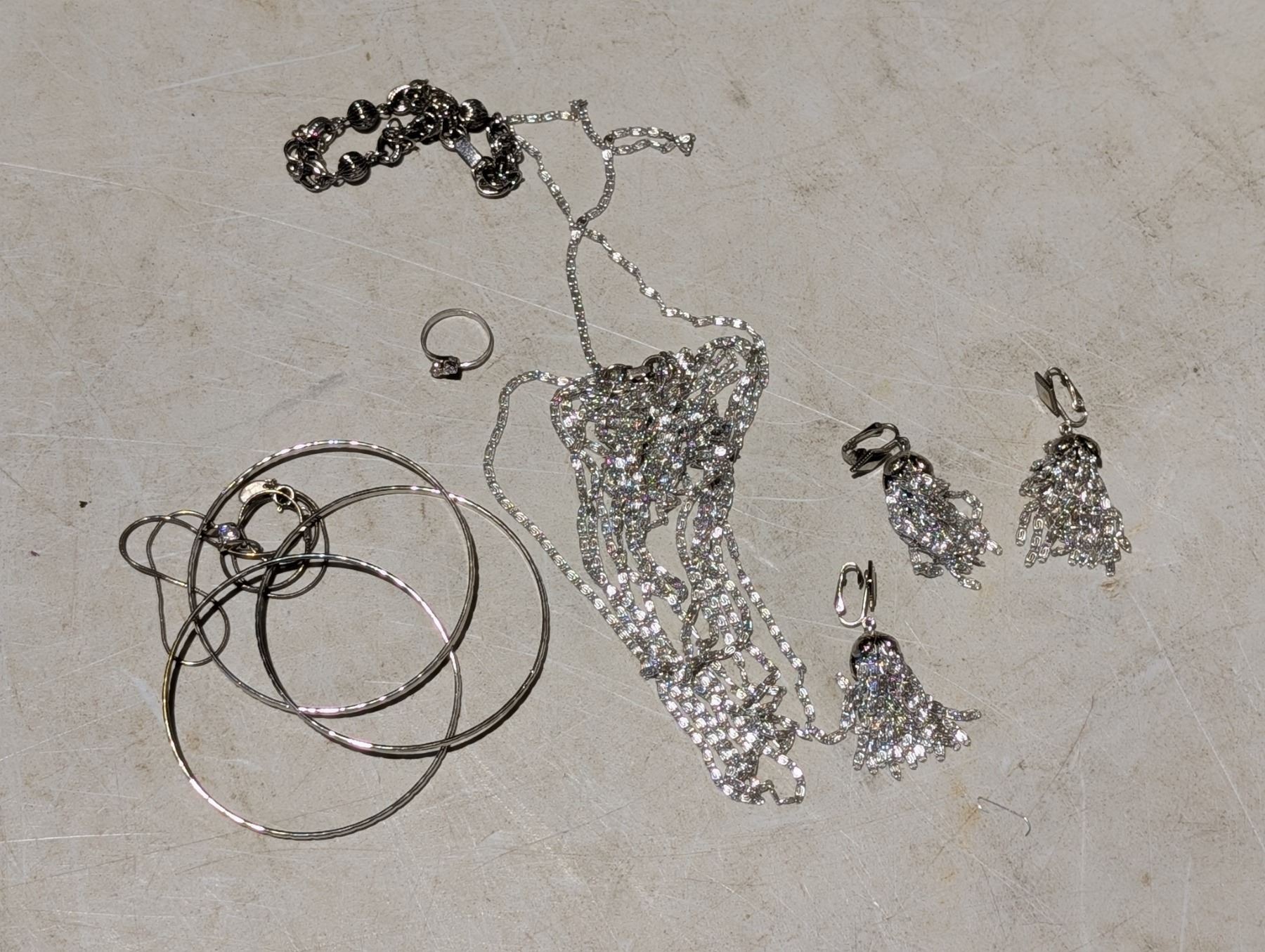 8.5" chain w/ Solitaire stone 3.5" bracelet, size 6 Diamond ring, and 3 Bangles
