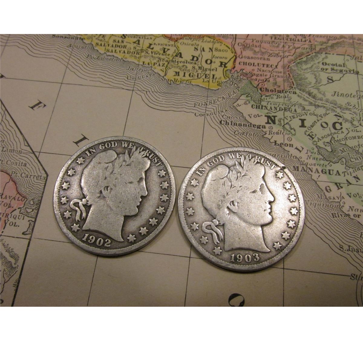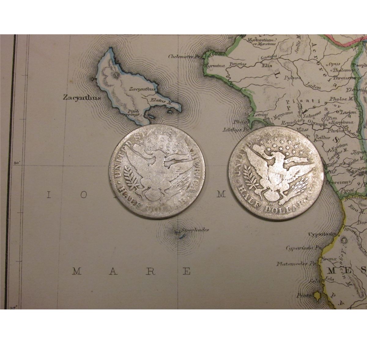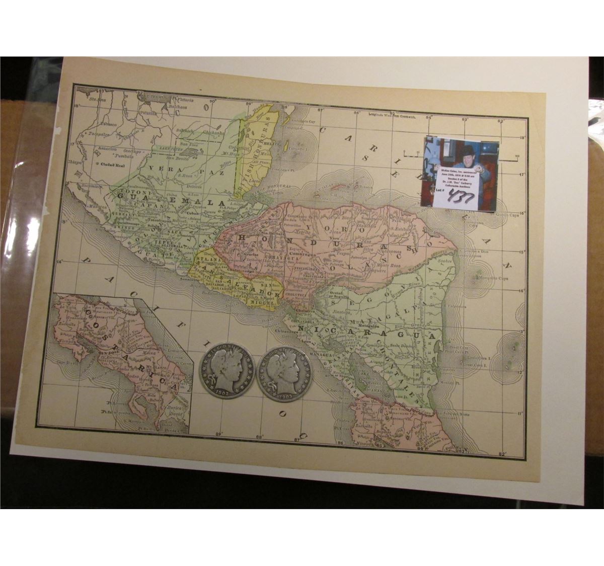 8.5" x 10 7/8" Map of "Central America" ready for framing; & 1902 P & 1903 P Barber Half Dollars in G-AG.