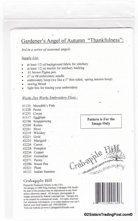 Pattern #252 'Gardener's Angel of Autumn-Thankfulness' Third in the series of four seasonal angels of Thankfulness. 2009 design by Meg hawkey for Crabapple Hill Studio.
