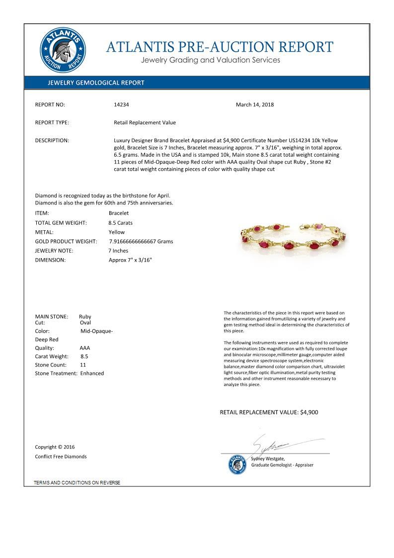 REF-68T2M -14234 ---- 8.50 CTW Ruby Bracelet 10K Yellow Gold ---- Luxury Designer Brand Bracelet Appraised at $4,900 Certificate Number US14234 10k Yellow gold, Bracelet Size is 7 Inches, Bracelet measuring approx. 7" x 3/16", weighing in total approx. 6.5 grams. Made in the USA and is stamped 10k, Main stone 8.5 carat total weight containing 11 pieces of Mid-Opaque-Deep Red color with AAA quality Oval shape cut Ruby , Stone #2 carat total weight containing pieces of color with quality shape cut