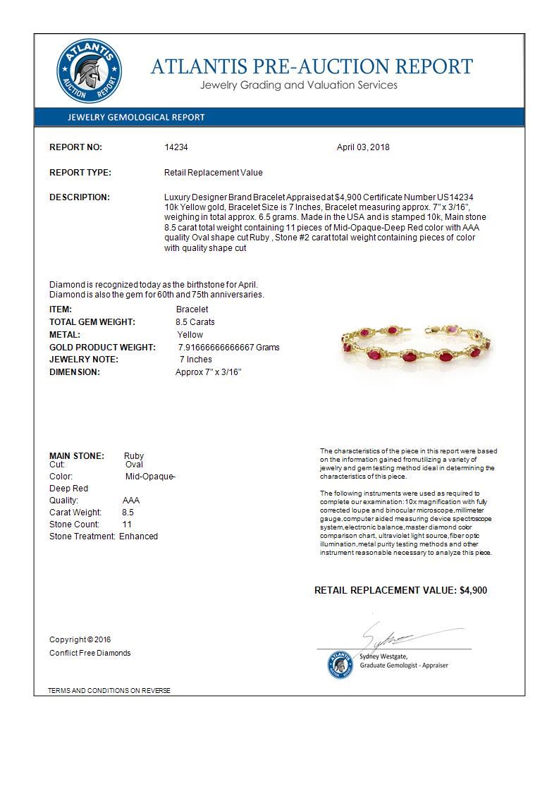 REF-68T2M -14234 ---- 8.50 CTW Ruby Bracelet 10K Yellow Gold ---- Luxury Designer Brand Bracelet Appraised at $4,900 Certificate Number US14234 10k Yellow gold, Bracelet Size is 7 Inches, Bracelet measuring approx. 7" x 3/16", weighing in total approx. 6.5 grams. Made in the USA and is stamped 10k, Main stone 8.5 carat total weight containing 11 pieces of Mid-Opaque-Deep Red color with AAA quality Oval shape cut Ruby , Stone #2 carat total weight containing pieces of color with quality shape cut