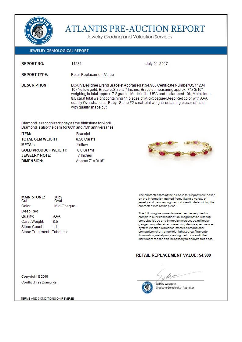 8.50 CTW Ruby Bracelet 10K Yellow Gold ---- Luxury Designer Brand Bracelet Appraised Retail Price at $4,900 ---- SKU Number US14234 10k Yellow gold Bracelet Size is 7 Inches, Bracelet measuring approx. 7" x 3/16", weighing in total approx. 7.2 grams. Made in the USA and is stamped 10k, Main stone 8.5 carat total weight containing 11 pieces of Mid-Opaque-Deep Red color with AAA quality Oval shape cut Ruby , Stone #2 carat total weight containing pieces of color with quality shape cut