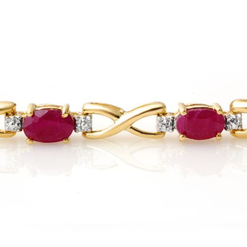 8.50 CTW Ruby & Diamond Bracelet 10K Yellow Gold ---- Luxury Designer Brand Bracelet Appraised Retail Price at $3,350 ---- SKU Number US14067 10k Yellow gold Bracelet Size is 7 Inches, Bracelet measuring approx. 7" x 3/16", weighing in total approx. 6.9 grams. Made in the USA and is stamped 10k, Main stone 8.47 carat total weight containing 10 pieces of Mid-Opaque-Deep Red color with AAA quality Oval shape cut Ruby , Stone #2 0.03 carat total weight containing 4 pieces of H-I color with VS/SI quality Round shape cut