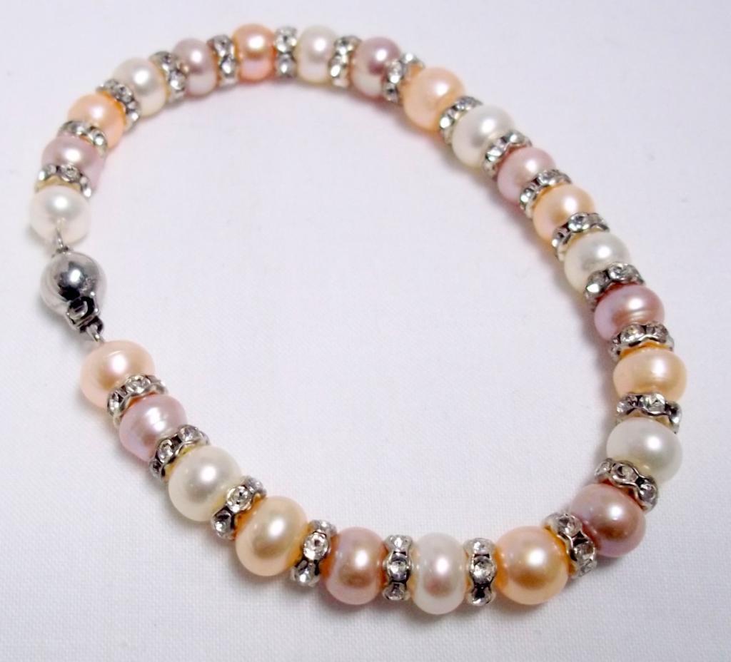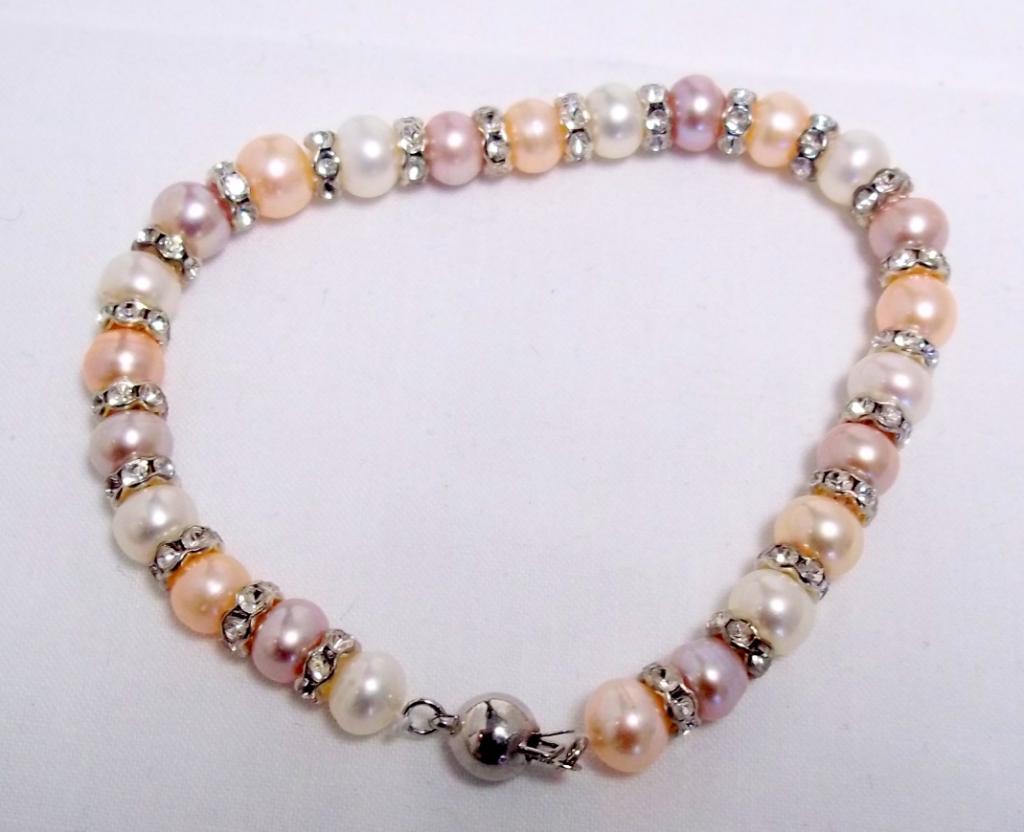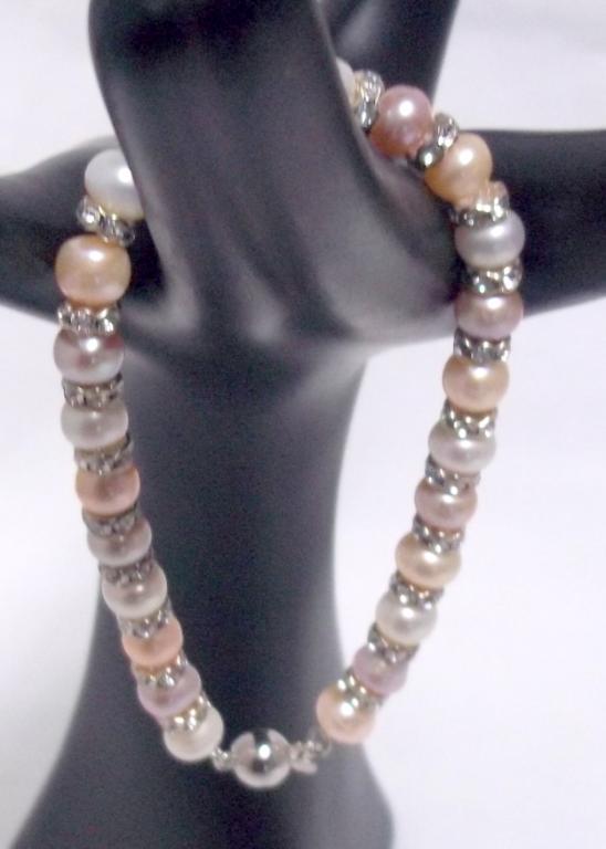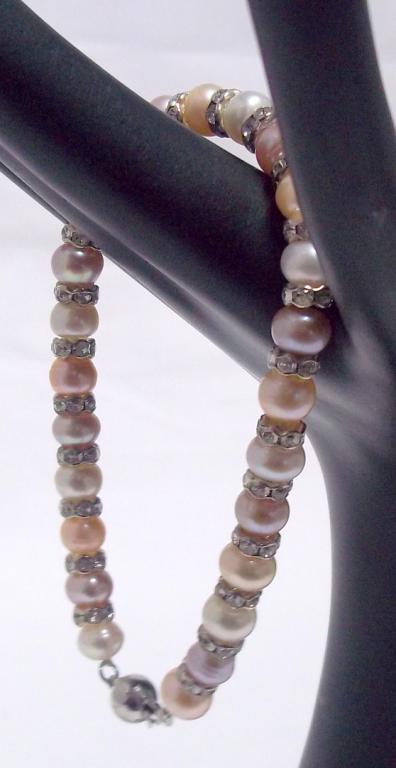 This lovely bracelet is made with tri colored fresh water pearls and accented with roundells. The retail price is $340-.