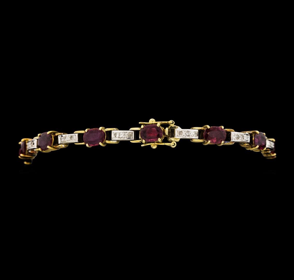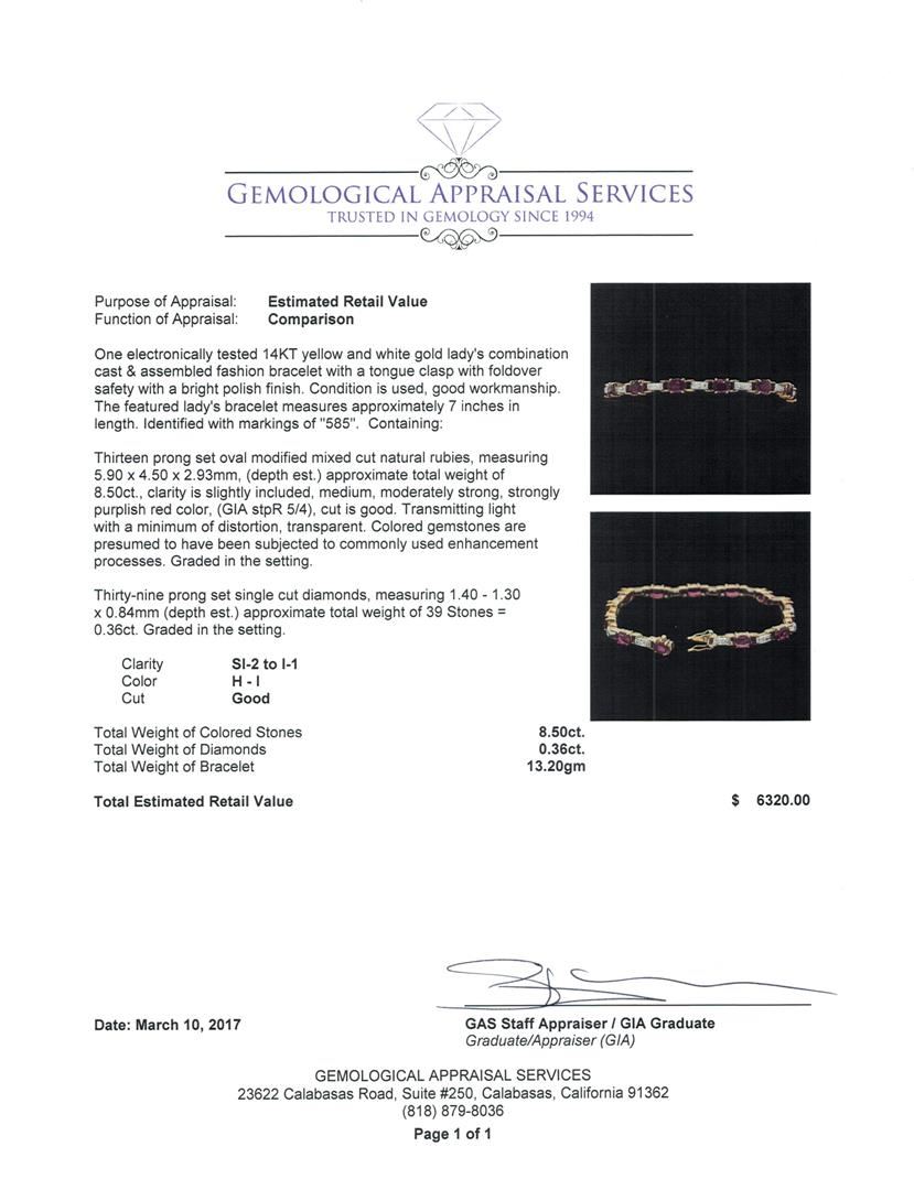 One electronically tested 14KT yellow and white gold lady's combination cast & assembled fashion bracelet with a tongue clasp with foldover safety with a bright polish finish. The featured lady's bracelet measures approximately 7 inches in length. Identified with markings of '585'. Condition is used, good workmanship. Containing: Thirteen prong set oval modified mixed cut natural rubies, measuring 5.90 x 4.50 x 2.93mm, (depth est.) approximate total weight of 8.50ct., clarity is slightly included, medium, moderately strong, strongly purplish red color, (GIA stpR 5/4), cut is good. Transmitting light with a minimum of distortion, transparent. Colored gemstones are presumed to have been subjected to commonly used enhancement processes. Graded in the setting. Thirty-Nine prong set single cut diamonds, measuring 1.40 - 1.30 x 0.84mm (depth est.) approximate total weight of 39 Stones = 0.36ct. Graded in the setting. Color H - I Clarity SI-2 to I-1 Cut Good. Total Weight of Colored Stones 8.50ct.. Total Weight of Diamonds 0.36ct.. Total Weight of Bracelet 13.20gm GAS Appraised at $6,320.00.