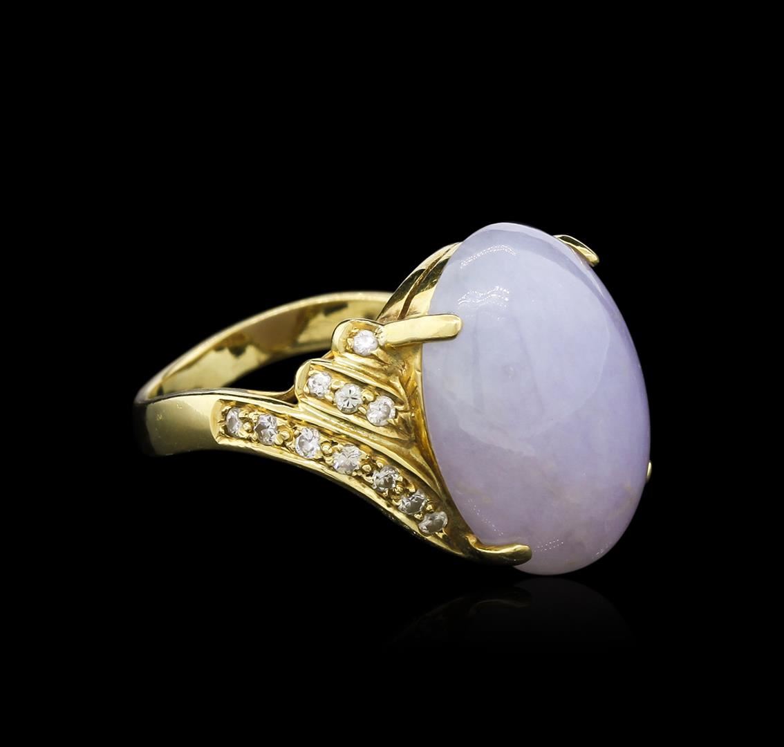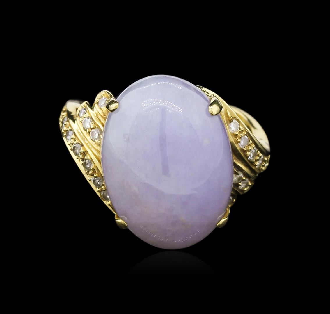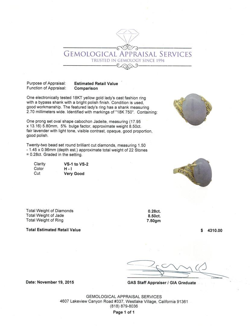 One electronically tested 18KT yellow gold lady's cast fashion ring with a bypass shank with a bright polish finish. The featured lady's ring has a shank measuring 2.70 millimeters wide. Identified with markings of "18K 750". Condition is used, good workmanship. Containing: One prong set oval shape cabochon Jadeite, measuring (17.95 x 13.16) 5.80mm, 5%. bulge factor, approximate weight 8.50ct. fair lavender with light tone, visible contrast, opaque, good proportion, good polish. Twenty-Two bead set round brilliant cut diamonds, measuring 1.50 - 1.45 x 0.96mm (depth est.) approximate total weight of 22 Stones = 0.28ct. Graded in the setting. Clarity: VS-1 to VS-2. Color: H - I. Cut Very Good. Total Weight of Diamonds 0.28ct. Total Weight of Jade 8.50ct. Total Weight of Ring 7.50gm. GAS Appraised at $4,310.00.