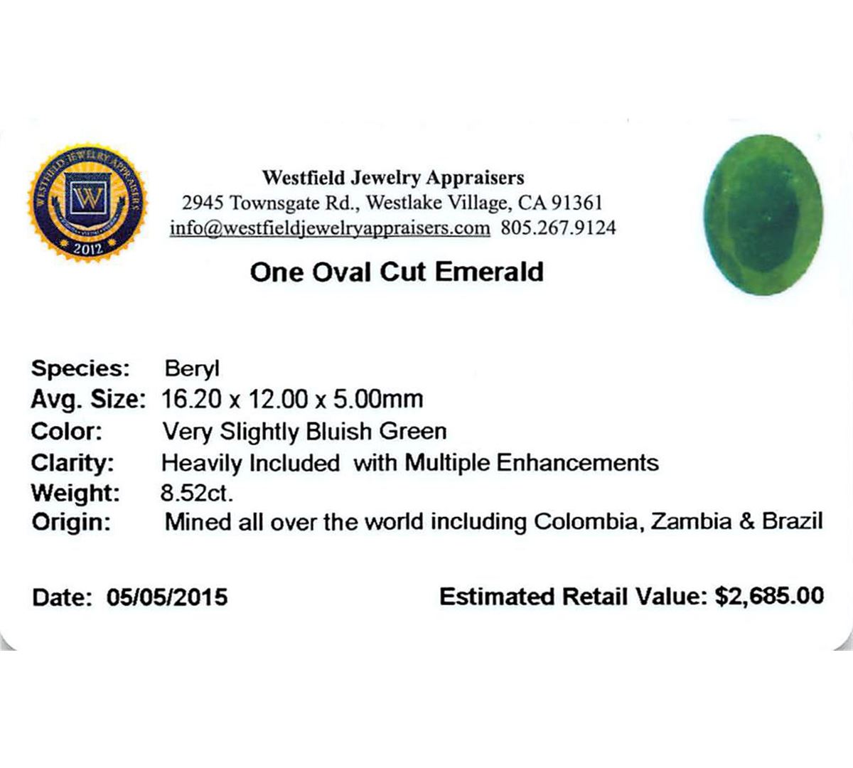 One oval cut natural emerald, measuring 16.20 x 12.00 x 5.00mm, exact weight 8.52ct., clarity is moderately included, type III, medium dark, very slightly grayish, very slightly bluish green color, (GIA vslbG 6/3), cut is good. Indications of multiple laboratory enhancements, including high temperature heat treatment. Westfield Appraised at $2,685.00.