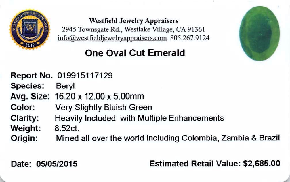 One oval cut natural emerald, measuring 16.20 x 12.00 x 5.00mm, exact weight 8.52ct., clarity is moderately included, type III, medium dark, very slightly grayish, very slightly bluish green color, (GIA vslbG 6/3), cut is good. Indications of multiple laboratory enhancements, including high temperature heat treatment. Westfield Appraised at $2,685.00.