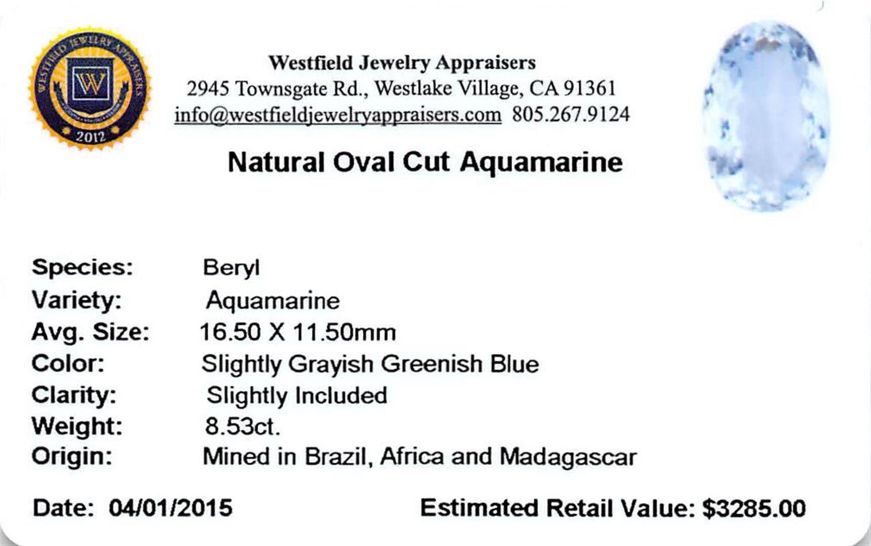 One oval cut natural aquamarine exact weight 8.53ct., clarity is slightly included, type I, medium, slightly grayish, very slightly greenish blue color, (GIA vslgB 5/2), cut is good. Westfield Appraised at $3,285.00.