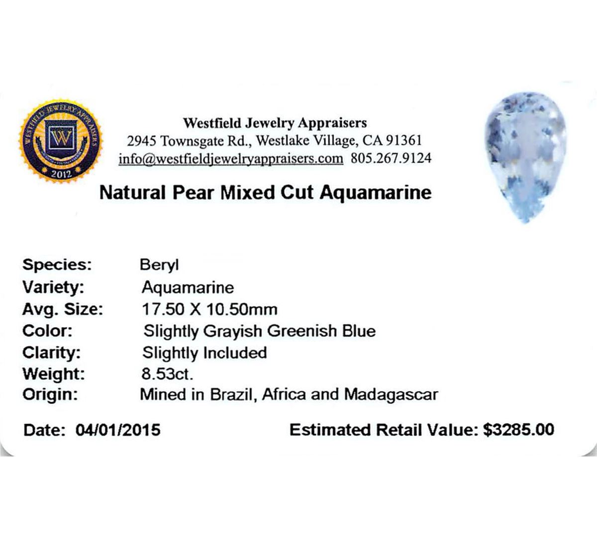 One pear cut natural aquamarine exact weight 8.53ct., clarity is slightly included, type I, medium, very slightly grayish, very slightly greenish blue color, (GIA vslgB 5/3), cut is good. Westfield Appraised at $3,285.00.