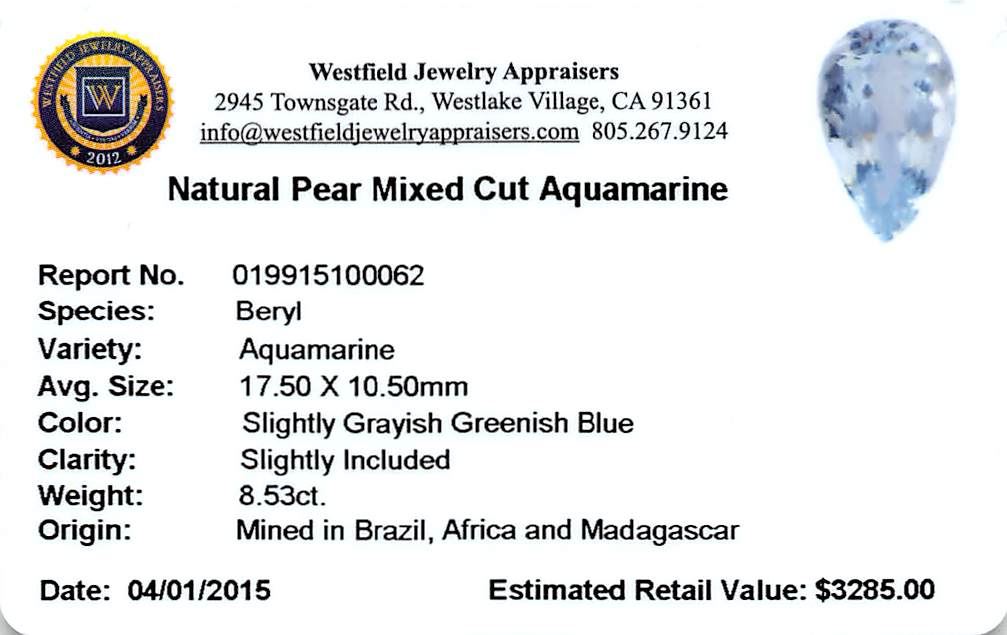 One pear cut natural aquamarine exact weight 8.53ct., clarity is slightly included, type I, medium, very slightly grayish, very slightly greenish blue color, (GIA vslgB 5/3), cut is good. Westfield Appraised at $3,285.00.