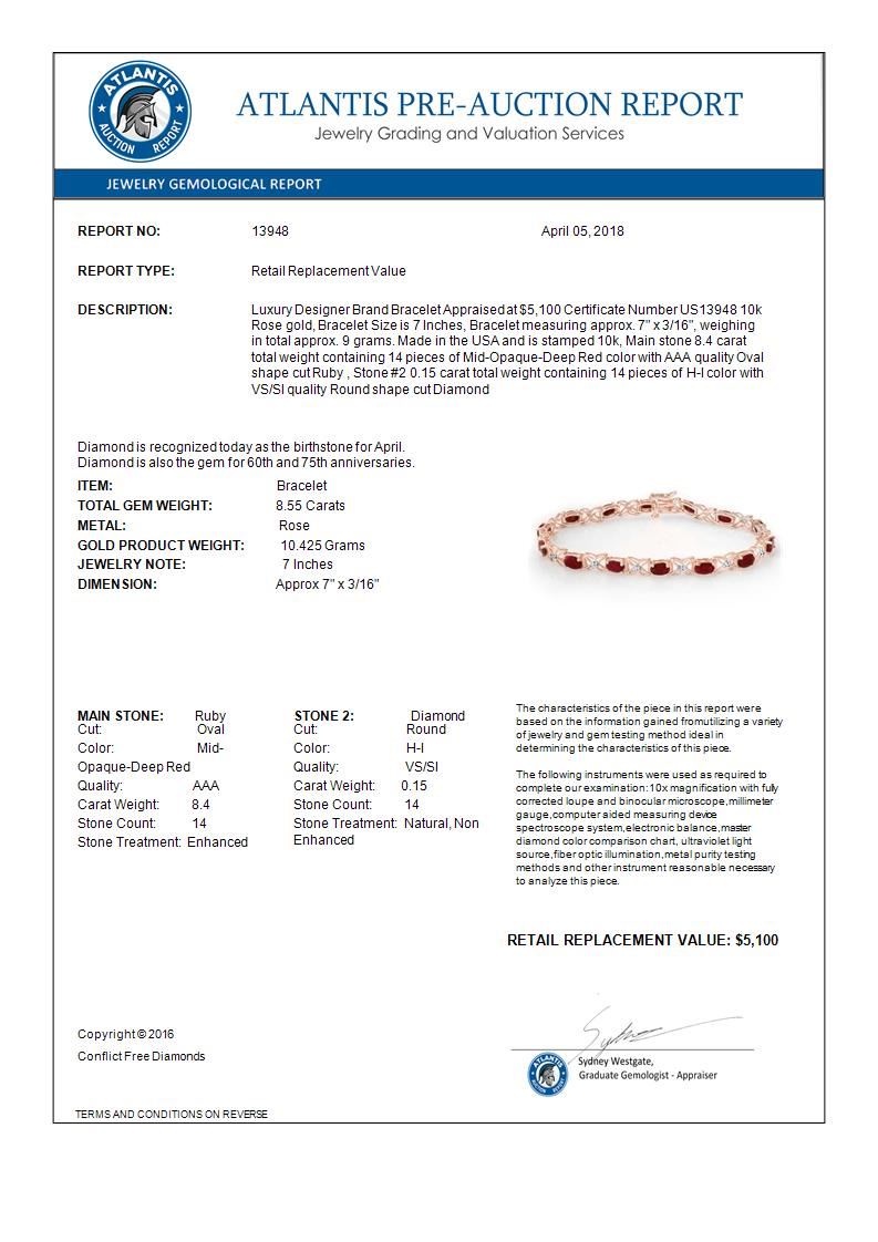 REF-71F6N -13948 ---- 8.55 CTW Ruby & Diamond Bracelet 10K Rose Gold ---- Luxury Designer Brand Bracelet Appraised at $5,100 Certificate Number US13948 10k Rose gold, Bracelet Size is 7 Inches, Bracelet measuring approx. 7" x 3/16", weighing in total approx. 9 grams. Made in the USA and is stamped 10k, Main stone 8.4 carat total weight containing 14 pieces of Mid-Opaque-Deep Red color with AAA quality Oval shape cut Ruby , Stone #2 0.15 carat total weight containing 14 pieces of H-I color with VS/SI quality Round shape cut Diamond
