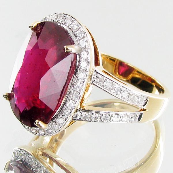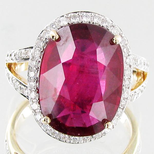 Excellent NEW well crafted 14k gold piece with main stone a fuscia red ruby; 56 SI-H white accent diamonds round full cut; lab quality evaluation 9; treatment as noted; Jeweler wholesale $8000; full retail appraisal $23051; full lab evaluation available