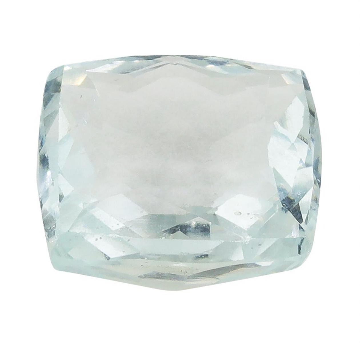 One natural cushion cut aquamarine with an exact weight of 8.58ct., clarity is eye clean, slightly grayish greenish blue, light. Gemological Appraisals Services estimates the retail value at $3303.3 GAS Appraised.