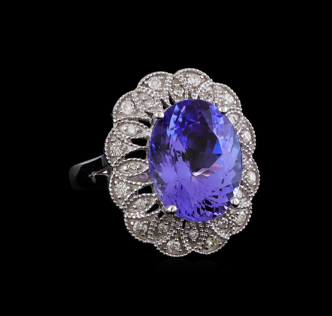 One electronically tested 14KT white gold lady's cast fashion ring with a basket halo with a bright polish with milgrain detailing finish. The featured lady's has a shank measuring 2.78 millimeters in width. Identified with markings of "K14". Condition is new, good workmanship. Containing: One prong set oval modified brilliant cut natural tanzanite, measuring 14.45 x 11.38 x 7.97mm, (depth est.) approximate weight of 8.58ct., clarity is eye clean, medium light, very slightly grayish, violetish blue color, (GIA vB 4/3), cut is good. Transmitting light with no distortion, transparent. Colored gemstones are presumed to have been subjected to commonly used enhancement processes. Graded in the setting. Twelve prong set round brilliant cut diamonds, measuring 1.80 - 1.75 x 1.11mm (depth est.) approximate total weight of 12 Stones = 0.26ct. Graded in the setting. Clarity: SI-1 to SI-2. Color: G - Good Twelve prong set round brilliant cut diamonds, measuring 1.50 - 1.40 x 0.90mm (depth est.) approximate total weight of 12 Stones = 0.14ct. Graded in the setting. Clarity: SI-1 to SI-2. Color: G - Good. Total Weight of Colored Stones 8.58ct. Total Weight of Diamonds 0.40ct. Total Weight of Ring 10.10gm.