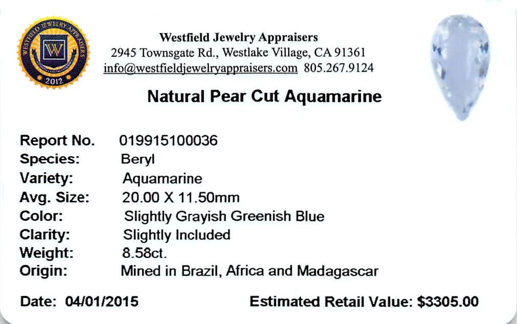 One pear cut natural aquamarine exact weight 8.58ct., clarity is slightly included, type I, medium, very slightly grayish, very slightly greenish blue color, (GIA vslgB 5/3), cut is good. Westfield Appraised at $3,305.00.