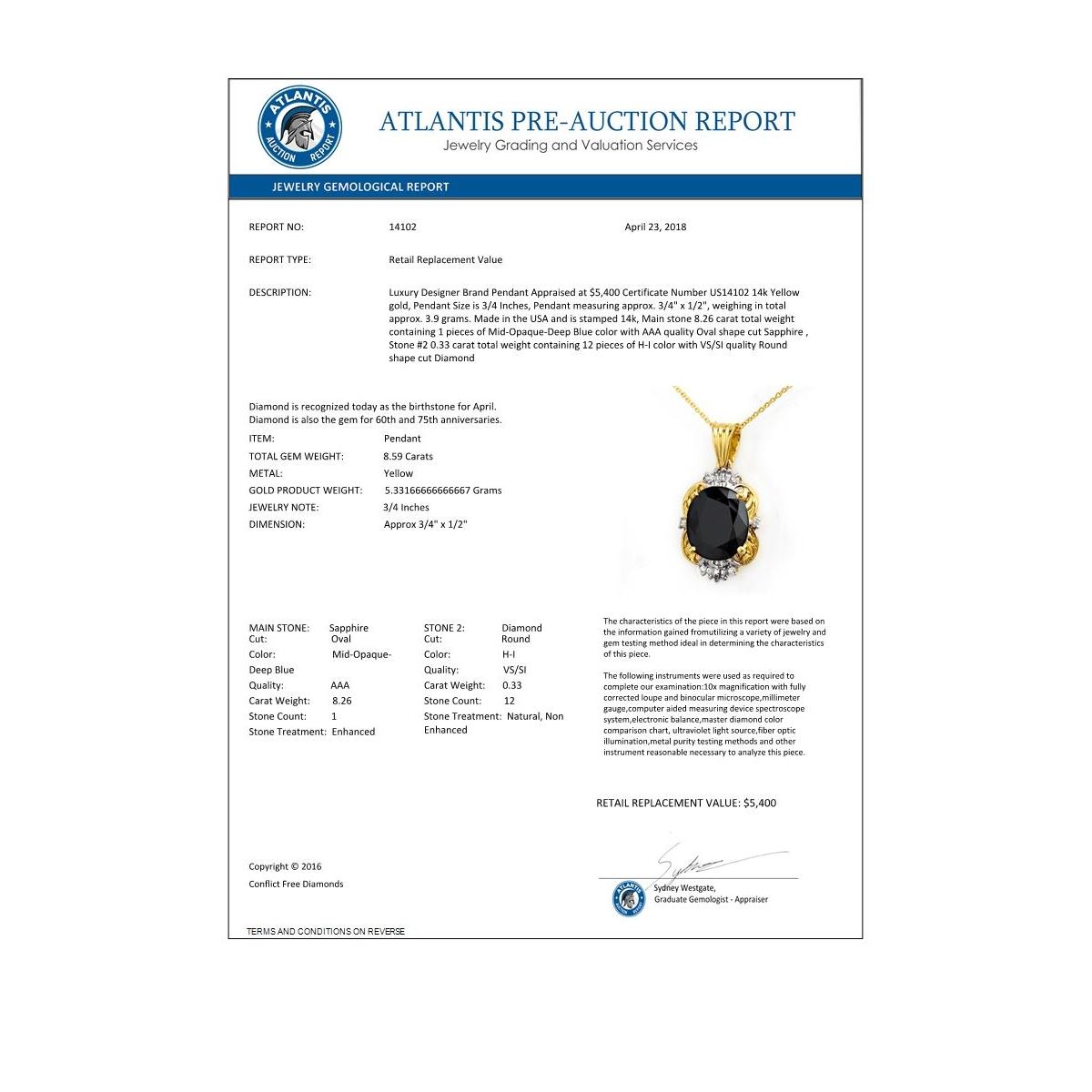 REF-81W8F -14102 ---- 8.59 CTW Blue Sapphire & Diamond Pendant 14K Yellow Gold ---- Luxury Designer Brand Pendant Appraised at $5,400 Certificate Number US14102 14k Yellow gold, Pendant Size is 3/4 Inches, Pendant measuring approx. 3/4" x 1/2", weighing in total approx. 3.9 grams. Made in the USA and is stamped 14k, Main stone 8.26 carat total weight containing 1 pieces of Mid-Opaque-Deep Blue color with AAA quality Oval shape cut Sapphire , Stone #2 0.33 carat total weight containing 12 pieces of H-I color with VS/SI quality Round shape cut Diamond