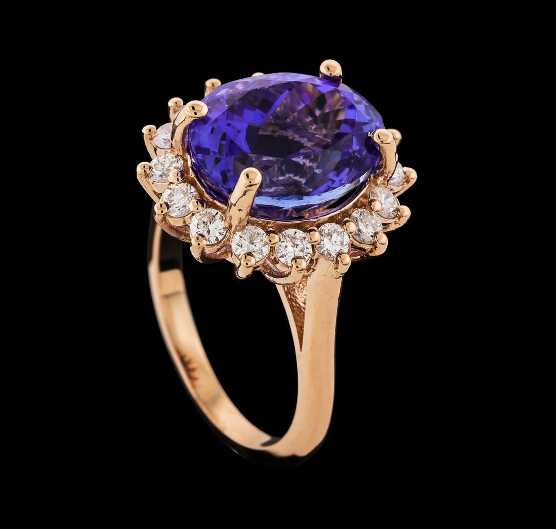One electronically tested 14KT rose gold lady's cast fashion ring with a basket halo with a bright polish finish. The featured lady's ring has a shank measuring 2.05 millimeters wide. Identified with markings of '14K'. Condition is new, good workmanship. Containing: One prong set oval modified brilliant cut natural tanzanite, measuring 13.14 x 10.48 x 8.50mm, (depth est.) 5%. bulge factor, approximate weight of 8.61ct., clarity is eye clean, medium, moderately strong, bluish violet color, (GIA bV 5/4), cut is very good. Transmitting light with no distortion, transparent. Colored gemstones are presumed to have been subjected to commonly used enhancement processes. Graded in the setting. Sixteen prong set round brilliant cut diamonds, measuring 2.40 - 2.35 x 1.48mm (depth est.) approximate total weight of 16 Stones = 0.82ct. Graded in the setting. Clarity VS-2 to SI-2. Color: G - H Cut Good. Total Weight of Colored Stones 8.61ct.. Total Weight of Diamonds 0.82ct.. Total Weight of Ring 7.10gm GAS Appraised at $13,640.00.
