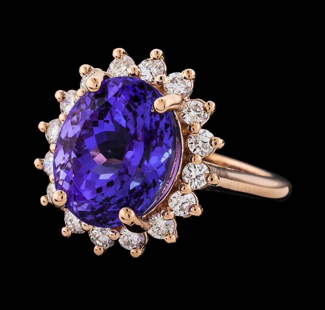 One electronically tested 14KT rose gold lady's cast fashion ring with a basket halo with a bright polish finish. The featured lady's ring has a shank measuring 2.05 millimeters wide. Identified with markings of '14K'. Condition is new, good workmanship. Containing: One prong set oval modified brilliant cut natural tanzanite, measuring 13.14 x 10.48 x 8.50mm, (depth est.) 5%. bulge factor, approximate weight of 8.61ct., clarity is eye clean, medium, moderately strong, bluish violet color, (GIA bV 5/4), cut is very good. Transmitting light with no distortion, transparent. Colored gemstones are presumed to have been subjected to commonly used enhancement processes. Graded in the setting. Sixteen prong set round brilliant cut diamonds, measuring 2.40 - 2.35 x 1.48mm (depth est.) approximate total weight of 16 Stones = 0.82ct. Graded in the setting. Clarity VS-2 to SI-2. Color: G - H Cut Good. Total Weight of Colored Stones 8.61ct.. Total Weight of Diamonds 0.82ct.. Total Weight of Ring 7.10gm GAS Appraised at $13,640.00.