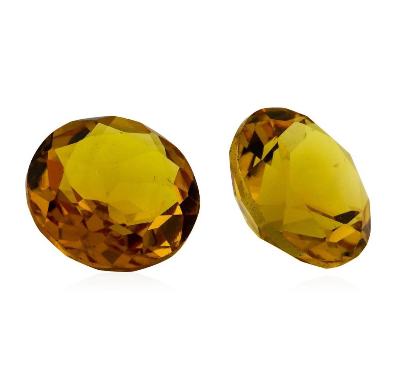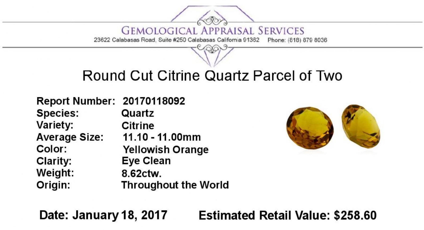 One natural round cut citrine quartz parcel of two with an exact weight of 8.62ctw., clarity is eye clean, yellowish orange. Gemological Appraisals Services estimates the retail value at $258.6 GAS Appraised.