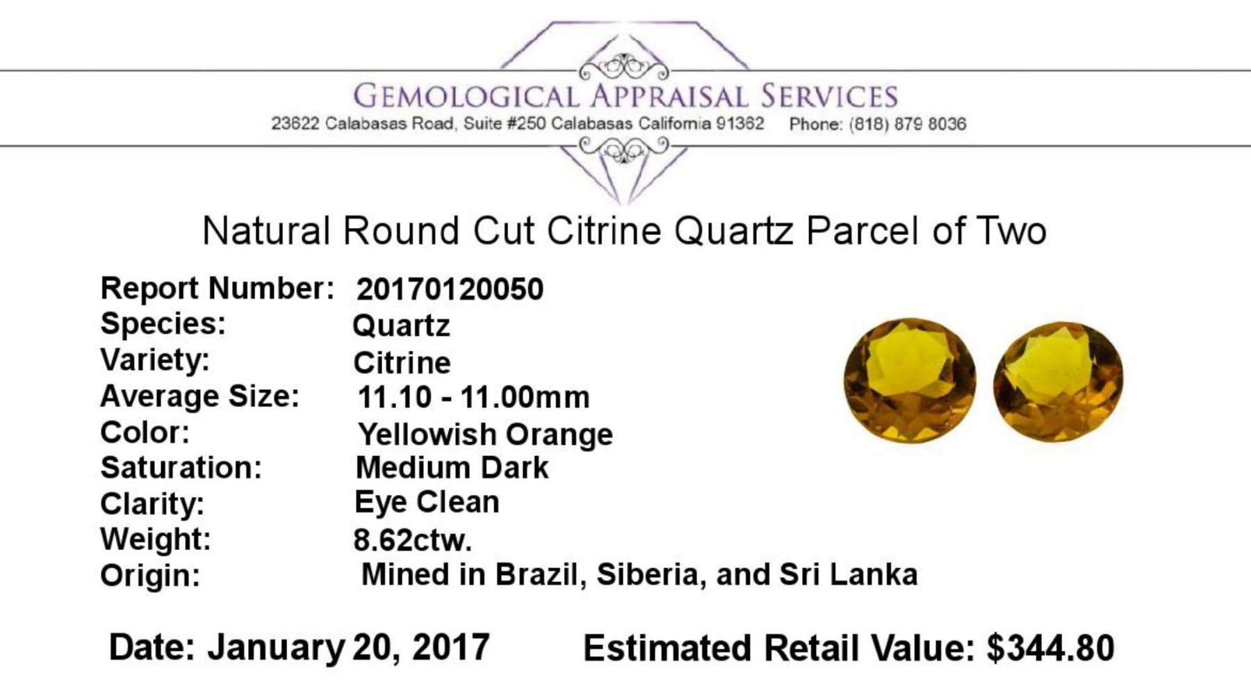 One natural round cut citrine quartz parcel of two with an exact weight of 8.62ctw., clarity is eye clean, yellowish orange, medium dark. Gemological Appraisals Services estimates the retail value at $344.8 GAS Appraised.