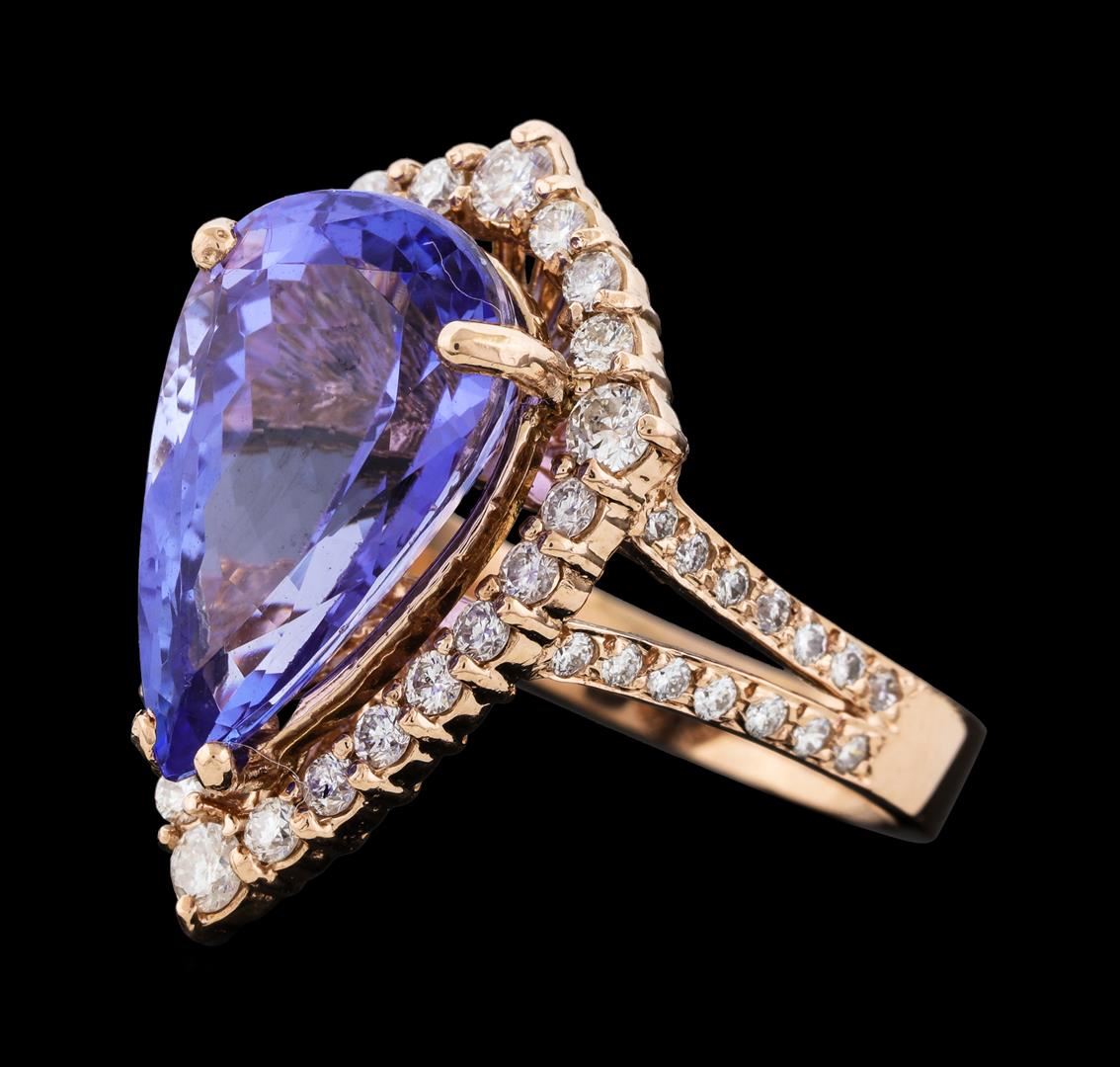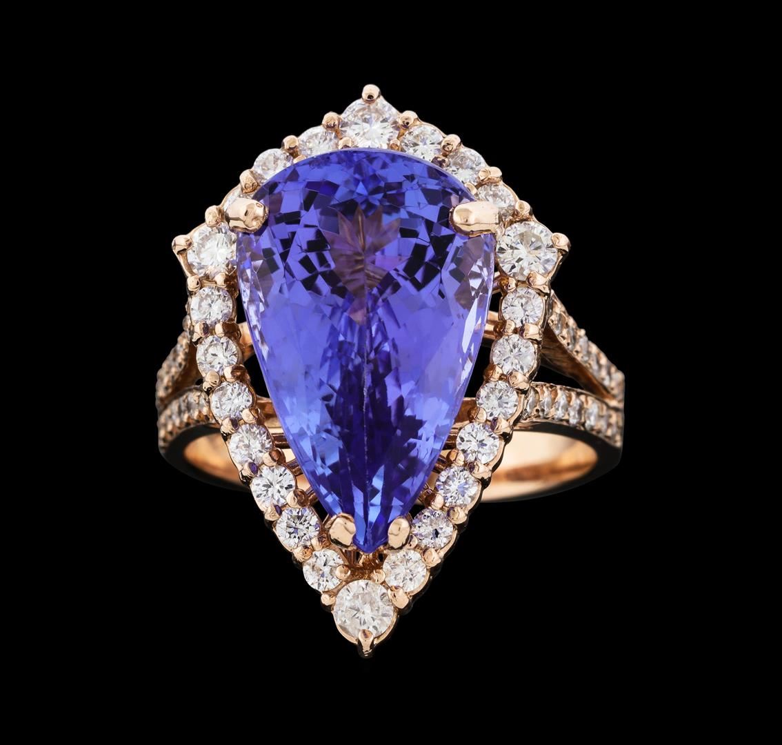 One electronically tested 14KT rose gold lady's cast fashion ring with a split shank basket halo with a bright polish finish. The featured lady's ring has a shank measuring 3.20 millimeters wide. Identified with markings of 'K14'. Condition is new, good workmanship. Containing: One prong set pear modified brilliant cut natural tanzanite, measuring 16.80 x 10.50 x 7.50mm, (depth est.) approximate weight of 8.62ct., clarity is eye clean, medium, moderately strong, violet color, (GIA V 5/4), cut is very good. Transmitting light with no distortion, transparent. Colored gemstones are presumed to have been subjected to commonly used enhancement processes. Graded in the setting. Four prong set round brilliant cut diamonds, measuring 2.50 - 2.45 x 1.54mm (depth est.) approximate total weight of 4 Stones = 0.23ct. Graded in the setting. Clarity SI-2 to I-1. Color: H - I Cut Good Twenty prong set round brilliant cut diamonds, measuring 1.80 - 1.70 x 1.09mm (depth est.) approximate total weight of 20 Stones = 0.42ct. Graded in the setting. Clarity SI-2 to I-1. Color: H - I Cut Good Twenty-Eight prong set round brilliant cut diamonds, measuring 1.40 - 1.35 x 0.84mm (depth est.) approximate total weight of 28 Stones = 0.27ct. Graded in the setting. Clarity SI-1 to I-1. Color: H - I Cut Good. Total Weight of Colored Stones 8.62ct.. Total Weight of Diamonds 0.92ct.. Total Weight of Ring 8.30gm. GAS Appraised at $13,270.00.