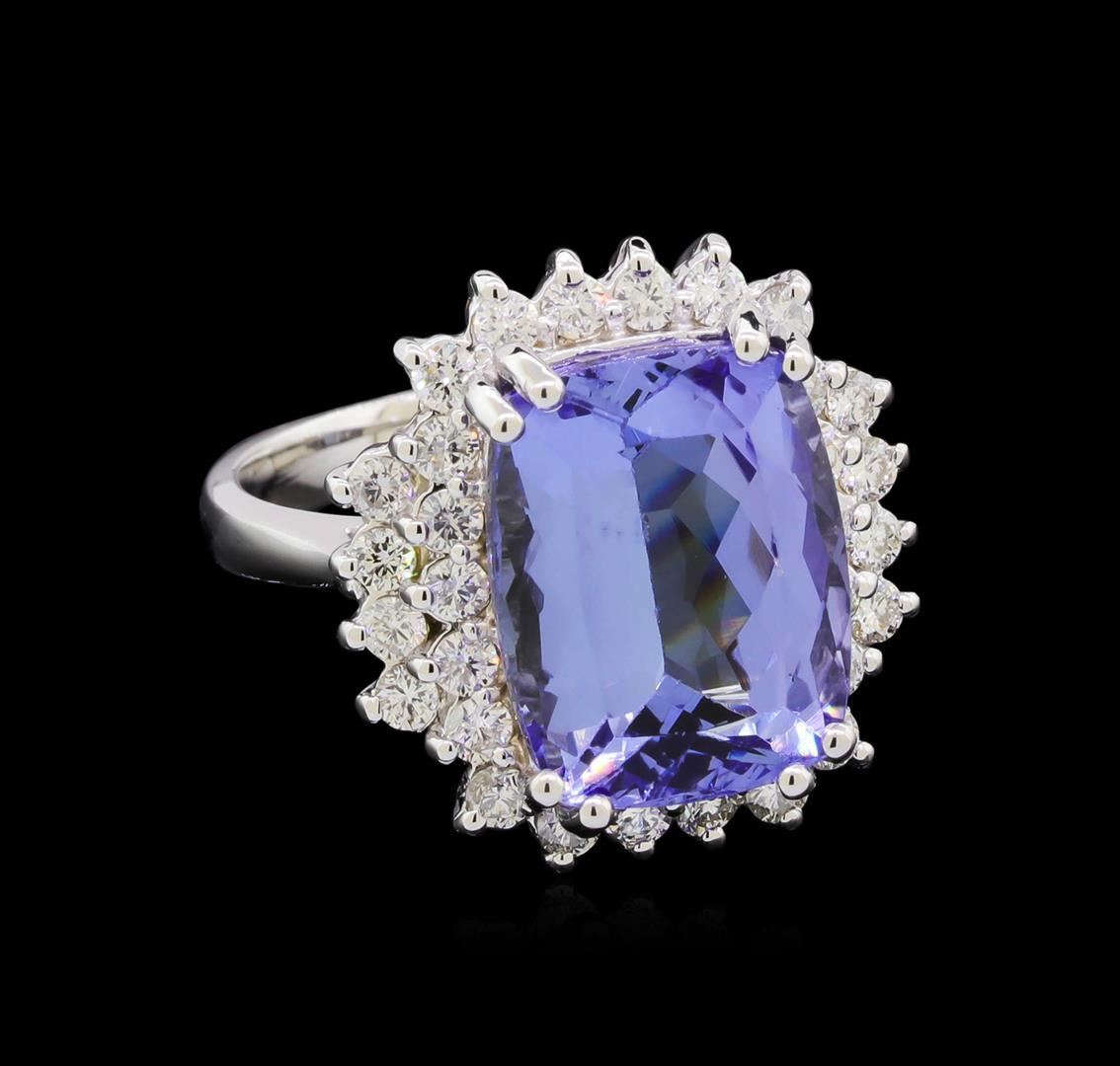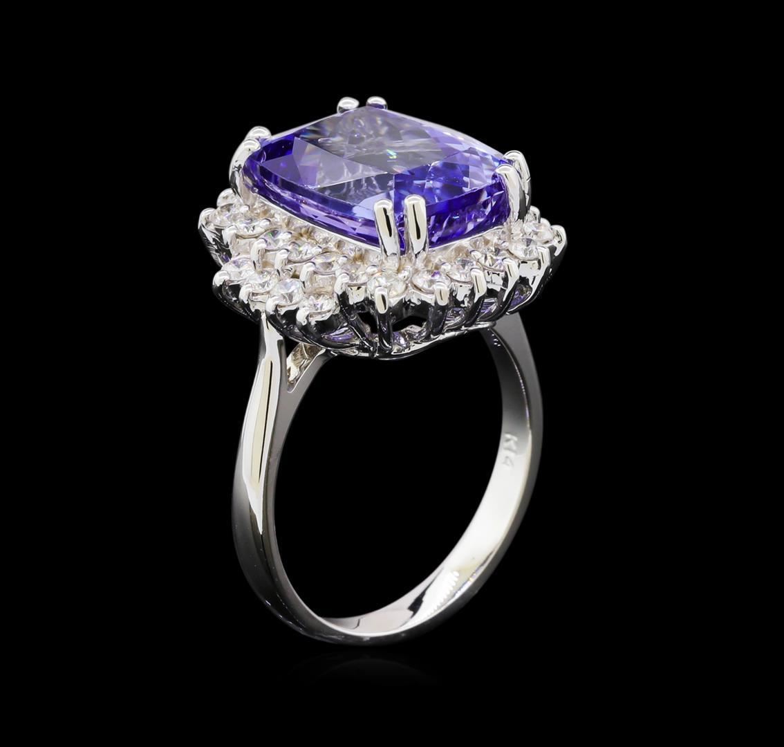 One electronically tested 14KT white gold lady's cast fashion ring with a basket halo with a bright polish finish. The featured lady's ring has a shank measuring 2.76 millimeters wide. Identified with markings of "K14". Condition is new, good workmanship. Containing: One prong set rectangular cushion modified brilliant cut natural tanzanite, measuring 13.19 x 10.46 x 7.15mm, 11%. bulge factor, approximate weight of 8.62ct., clarity is eye clean, type I, medium light, very slightly grayish, bluish violet color, (GIA bV 4/3), cut is very good. Transmitting light with no distortion, transparent. Colored gemstones are presumed to have been subjected to commonly used enhancement processes. Graded in the setting. Thirty prong set round brilliant cut diamonds, measuring 2.00 - 1.90 x 1.19mm (depth est.) approximate total weight of 30 Stones = 0.82ct. Graded in the setting. Clarity: VS-2 to SI-2. Color: G - Very Good. Total Weight of Colored Stones 8.62ct. Total Weight of Diamonds 0.82ct. Total Weight of Ring 7.30gm. GAS Appraised.