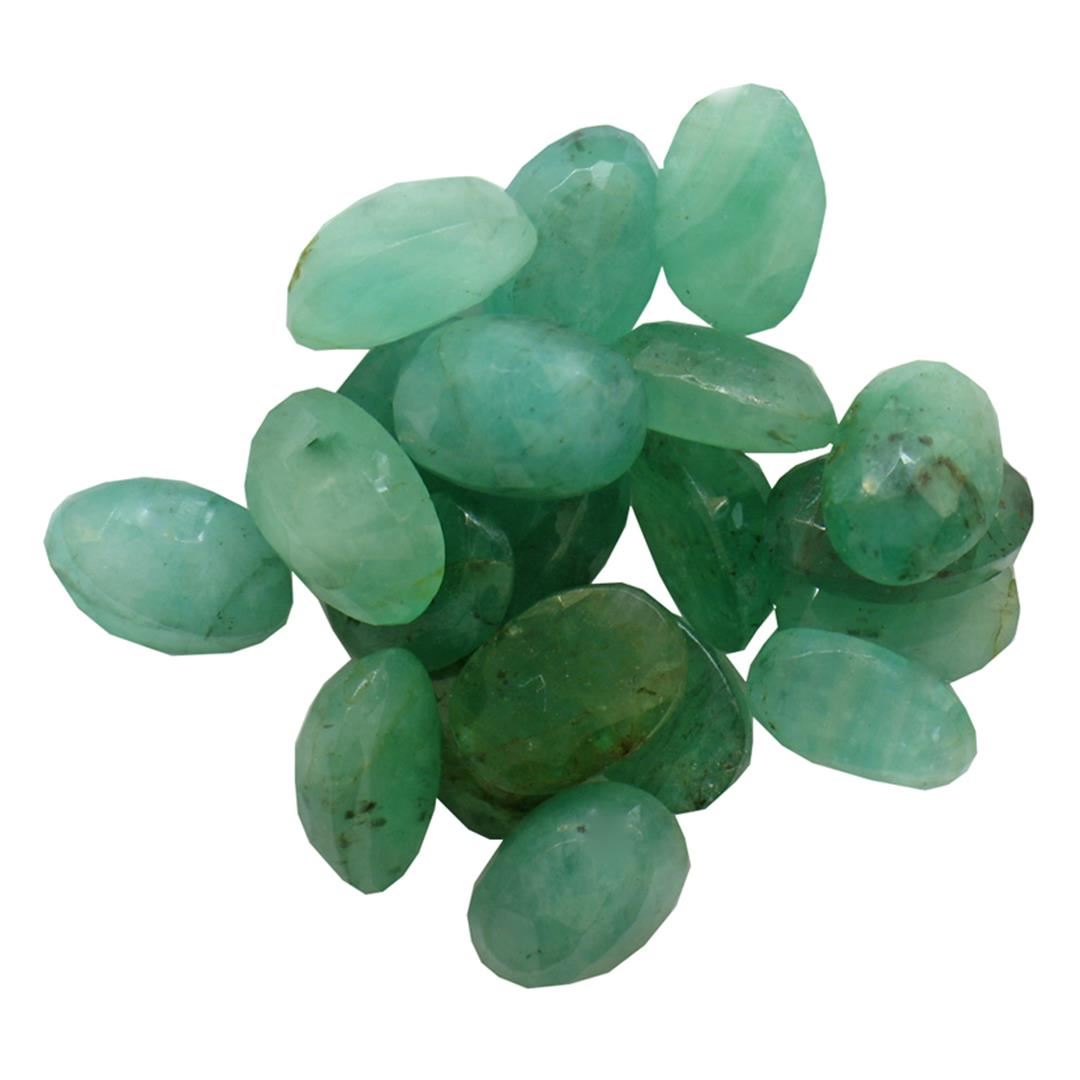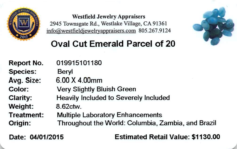 Twenty oval mixed cut natural emeralds exact total weight 8.62ct., clarity is heavily included, type III, medium, very slightly grayish, very slightly bluish green color, (GIA vslbG 5/3), cut is good. Westfield Appraised at $1,130.00.