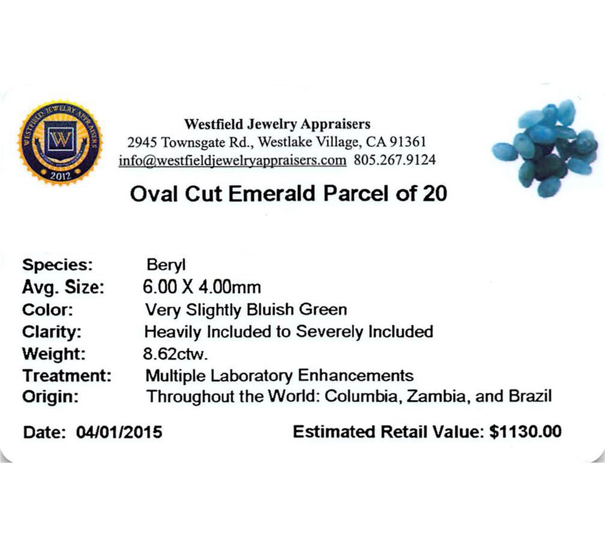 Twenty oval mixed cut natural emeralds exact total weight 8.62ct., clarity is heavily included, type III, medium, very slightly grayish, very slightly bluish green color, (GIA vslbG 5/3), cut is good. Westfield Appraised at $1,130.00.