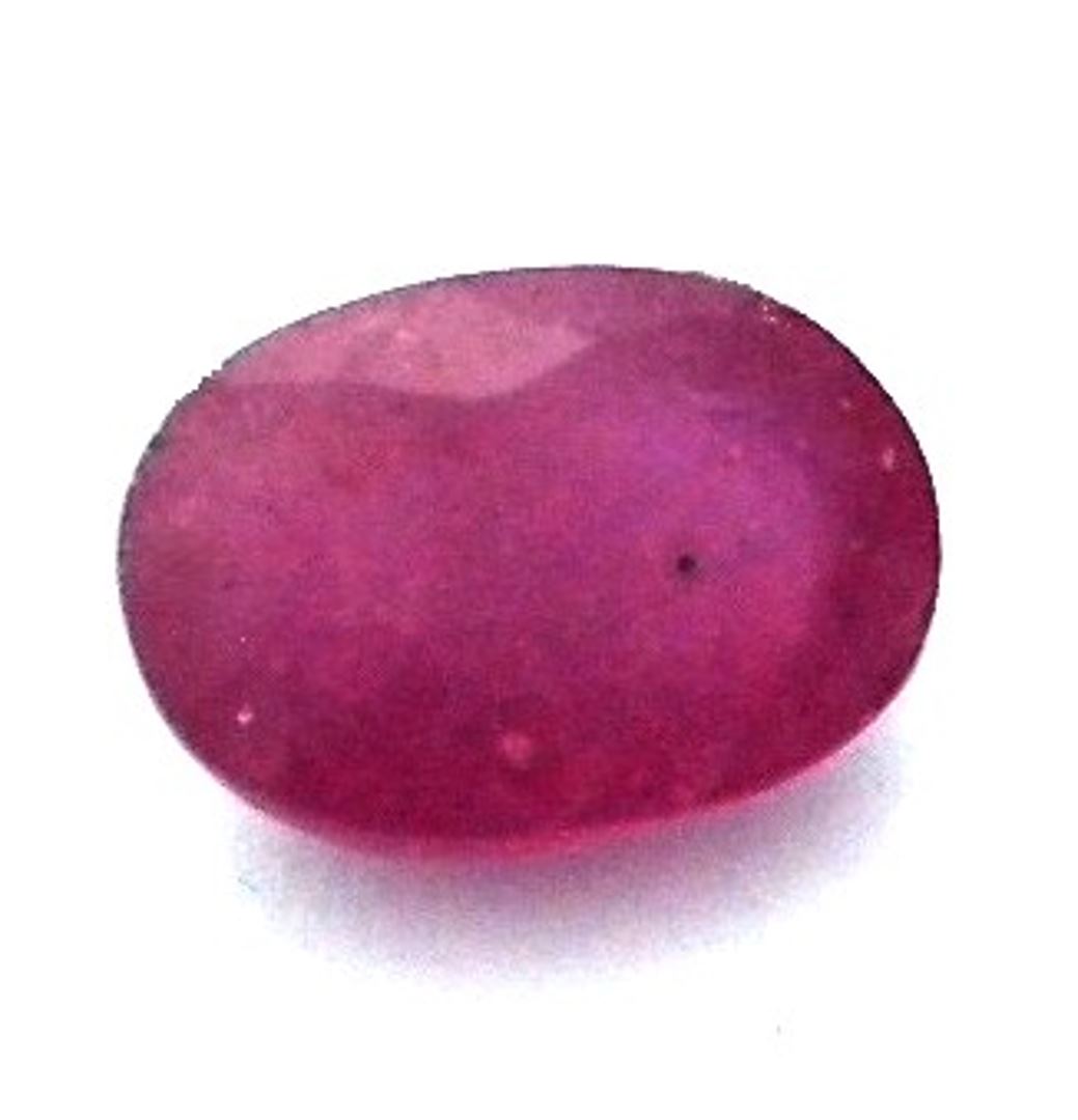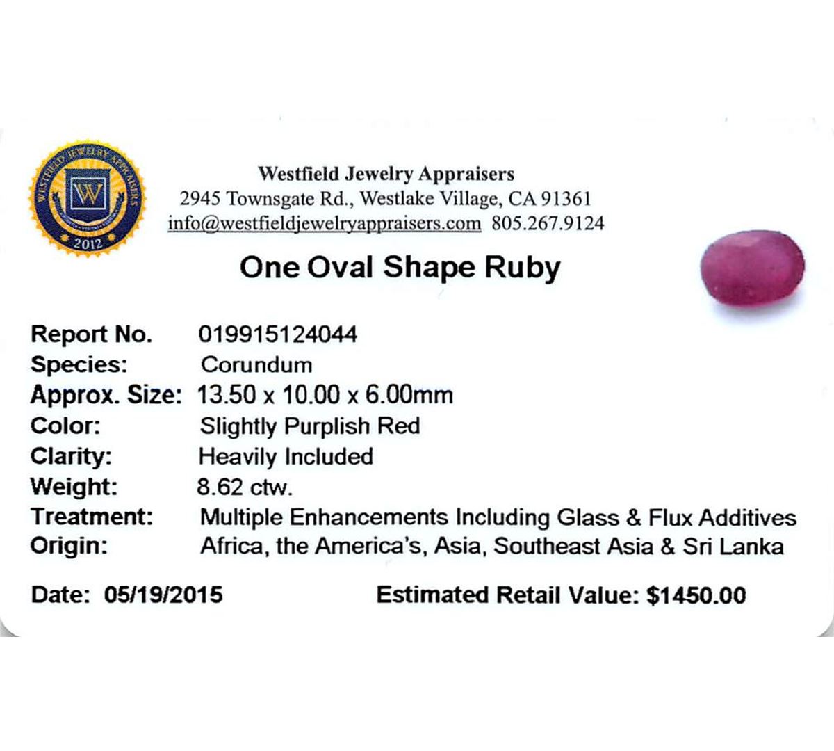 One oval mixed cut natural ruby, measuring 13.50 x 10.00 x 6.00mm, exact weight 8.62ct., clarity is heavily included, type II, medium dark, very slightly brownish, slightly purplish red color, (GIA slpR 6/3), cut is good. Westfield Appraised at $1,450.00.