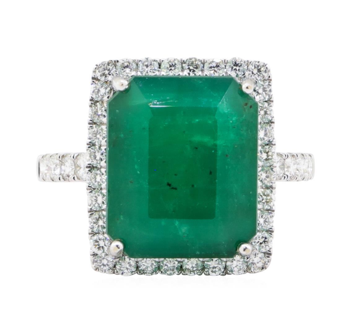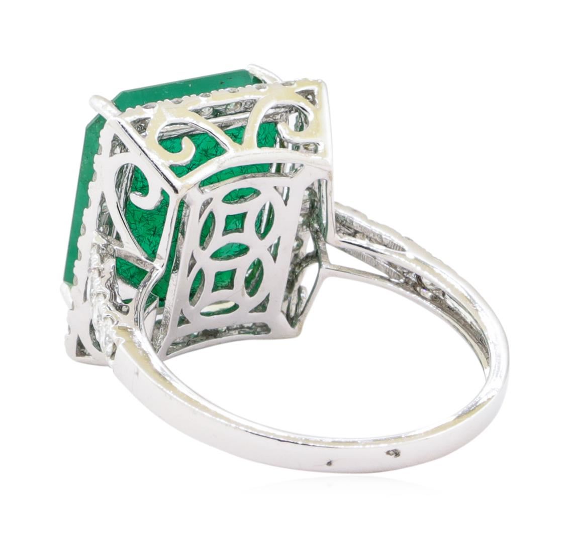 One electronically tested 18KT white gold ladies cast emerald and diamond ring with a bright polish finish. The featured emerald is set within a diamond bezel supported by diamond set shoulders, completed by a one and one-half millimeter wide band. Trademark is Orianne. Identified with markings of "18K". Condition is new, good workmanship. Containing: One prong set rectangular step cut natural emerald, measuring 13.30 x 11.10 x 8.15mm, approximate weight of 8.64ct., clarity is heavily included, type III, medium dark, very slightly grayish, very slightly bluish green color, (GIA vslbG 6/3), cut is good. Transmitting light somewhat diffusely, translucent. Naturally occurring internal & external characteristics are present. Indications of oil residue. Colored Stone Grading Report attached. Graded in the setting. Forty prong set round brilliant cut diamonds approximate total weight of 40 Stones = 0.73ct. Graded in the setting. Clarity VS-1 to VS-2 Color G - I Total Weight of Colored Stones 8.64 ct. Total Weight of Diamonds 0.73 ct. Total Weight of Ring 5.04 gm Estimated Retail Value $ 15,225.00 US