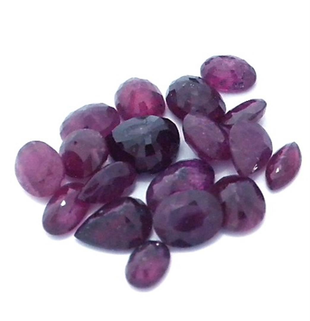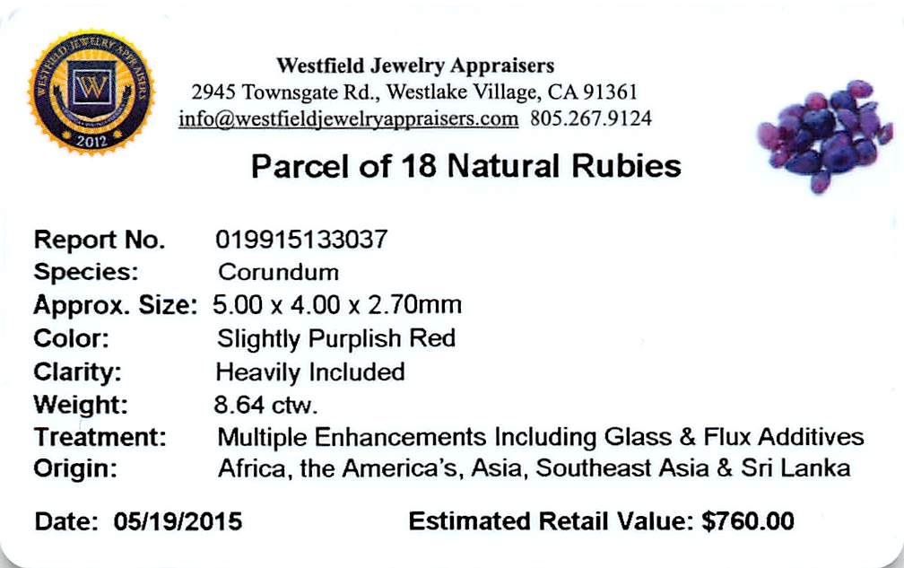 Eighteen various shapes & sizes cut natural rubies, measuring 5.00 x 4.00 x 2.70mm, exact total weight 8.64ct., clarity is heavily included, type II, dark, very slightly brownish, slightly purplish red color, (GIA slpR 7/3), cut is good. Measurements are an average for the group. Transmitting light somewhat diffusely, transparent to translucent. Naturally occurring internal & external characteristics are present. Indications of laboratory high temperature heat treatment, with glass & flux additives. Ruby has a low tolerance to rhodium plating, repolishing the surface, & ultrasonic cleaning. Westfield Appraised at $760.00.