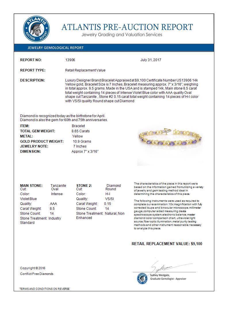 8.65 CTW Tanzanite & Diamond Bracelet 14K Yellow Gold ---- Luxury Designer Brand Bracelet Appraised Retail Price at $9,100 ---- SKU Number US13906 14k Yellow gold Bracelet Size is 7 Inches, Bracelet measuring approx. 7" x 3/16", weighing in total approx. 9.5 grams. Made in the USA and is stamped 14k, Main stone 8.5 carat total weight containing 14 pieces of Intense Violet Blue color with AAA quality Oval shape cut Tanzanite , Stone #2 0.15 carat total weight containing 14 pieces of H-I color with VS/SI quality Round shape cut