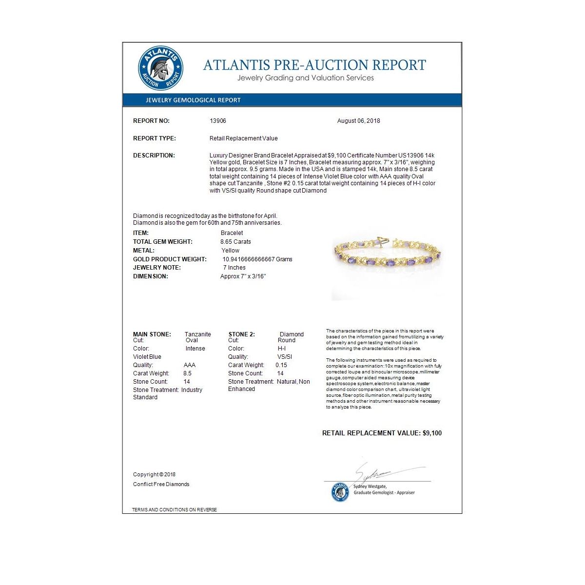 REF-118W2F -13906 ---- 8.65 CTW Tanzanite & Diamond Bracelet 14K Yellow Gold ---- Luxury Designer Brand Bracelet Appraised at $9,100 Certificate Number US13906  14k Yellow gold,  Bracelet Size is 7 Inches, Bracelet measuring approx. 7" x  3/16", weighing in total approx. 9.5 grams. Made in the USA and is stamped 14k, Main stone 8.5 carat total weight containing 14 pieces of Intense Violet Blue color with AAA quality Oval shape cut Tanzanite , Stone #2 0.15 carat total weight containing 14 pieces of H-I color with  VS/SI quality Round shape cut Diamond