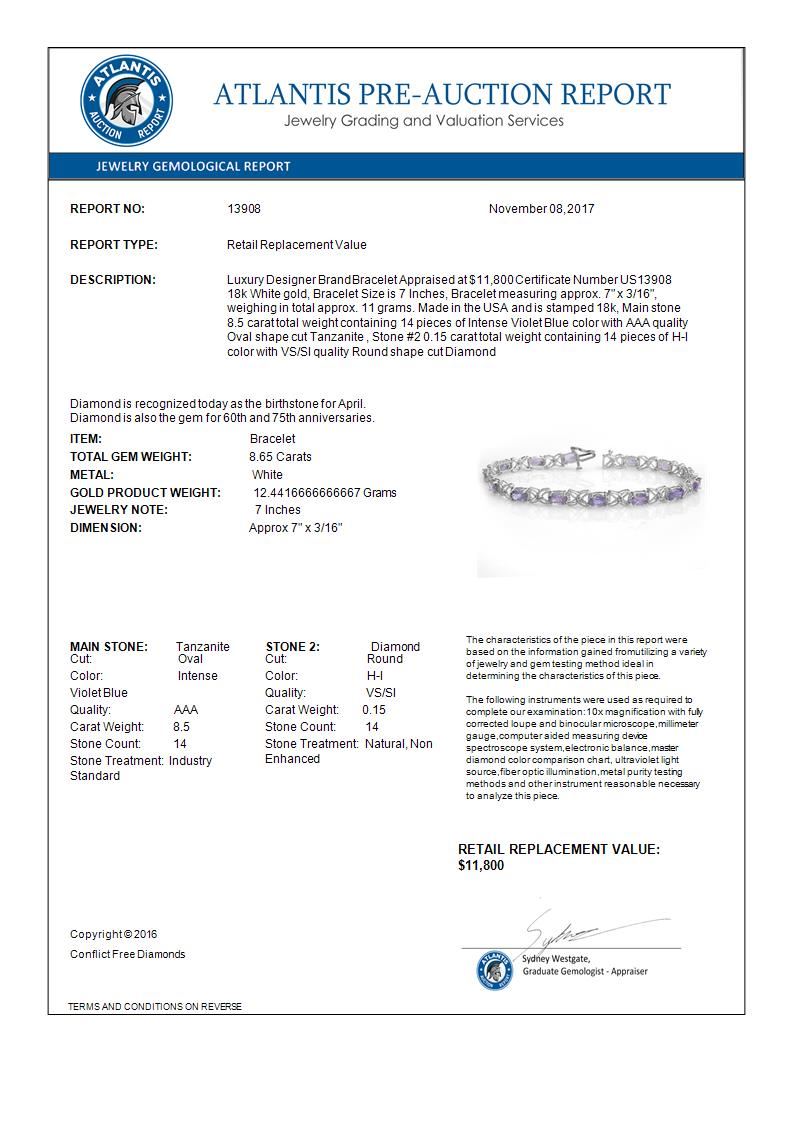 REF-153W3F -13908 ---- 8.65 CTW Tanzanite & Diamond Bracelet 18K White Gold ---- Luxury Designer Brand Bracelet Appraised at $11,800 Certificate Number US13908 18k White gold, Bracelet Size is 7 Inches, Bracelet measuring approx. 7" x 3/16", weighing in total approx. 11 grams. Made in the USA and is stamped 18k, Main stone 8.5 carat total weight containing 14 pieces of Intense Violet Blue color with AAA quality Oval shape cut Tanzanite , Stone #2 0.15 carat total weight containing 14 pieces of H-I color with VS/SI quality Round shape cut Diamond