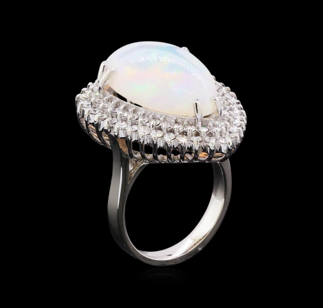 One electronically tested 14KT white gold lady's cast fashion ring with a basket double halo with a bright polish finish. The featured lady's ring has a shank measuring 3.25 millimeters in width. Identified with markings of "K14". Condition is new, good workmanship. Containing: One crystal opal that is cut in a pear shape and is prong set, measuring 21.81 mm long x 13.71 mm wide, and 6.85 mm thick and the approximate weight is 8.65 carats. The opal has a very bright, multicolor play of color (fire) in a rolling flashfire pattern; a medium dome; a good cut; no inclusions; consistent in its brightness and pattern; and is not directional. Thirty-Five prong set round brilliant cut diamonds, measuring 1.80 - 1.70 x 1.08mm (depth est.) approximate total weight of 35 Stones = 0.70ct. Graded in the setting. Clarity: VS-2 to SI-2. Color: G - Good Thirty-Four prong set round brilliant cut diamonds, measuring 1.50 - 1.40 x 0.90mm (depth est.) approximate total weight of 34 Stones = 0.42ct. Graded in the setting. Clarity: SI-1 to SI-2. Color: G - Good. Total Weight of Diamonds 1.12ct. Total Weight of Opals 8.65ct. Total Weight of Ring 12.00gm. GAS Appraised at $8,155.00.