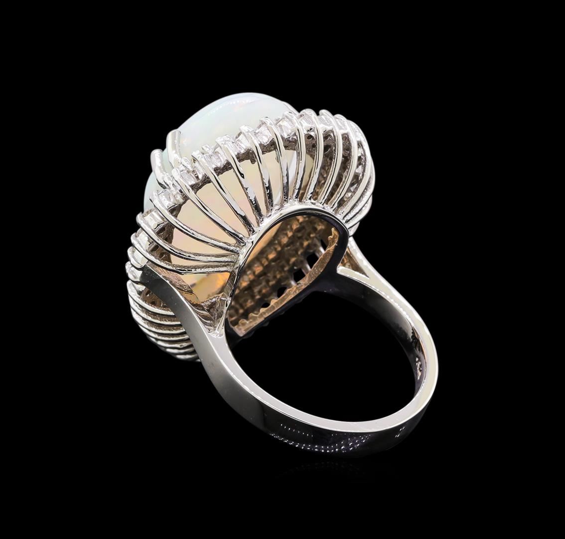 One electronically tested 14KT white gold lady's cast fashion ring with a basket double halo with a bright polish finish. The featured lady's ring has a shank measuring 3.25 millimeters in width. Identified with markings of "K14". Condition is new, good workmanship. Containing: One crystal opal that is cut in a pear shape and is prong set, measuring 21.81 mm long x 13.71 mm wide, and 6.85 mm thick and the approximate weight is 8.65 carats. The opal has a very bright, multicolor play of color (fire) in a rolling flashfire pattern; a medium dome; a good cut; no inclusions; consistent in its brightness and pattern; and is not directional. Thirty-Five prong set round brilliant cut diamonds, measuring 1.80 - 1.70 x 1.08mm (depth est.) approximate total weight of 35 Stones = 0.70ct. Graded in the setting. Clarity: VS-2 to SI-2. Color: G - Good Thirty-Four prong set round brilliant cut diamonds, measuring 1.50 - 1.40 x 0.90mm (depth est.) approximate total weight of 34 Stones = 0.42ct. Graded in the setting. Clarity: SI-1 to SI-2. Color: G - Good. Total Weight of Diamonds 1.12ct. Total Weight of Opals 8.65ct. Total Weight of Ring 12.00gm. GAS Appraised at $8,155.00.