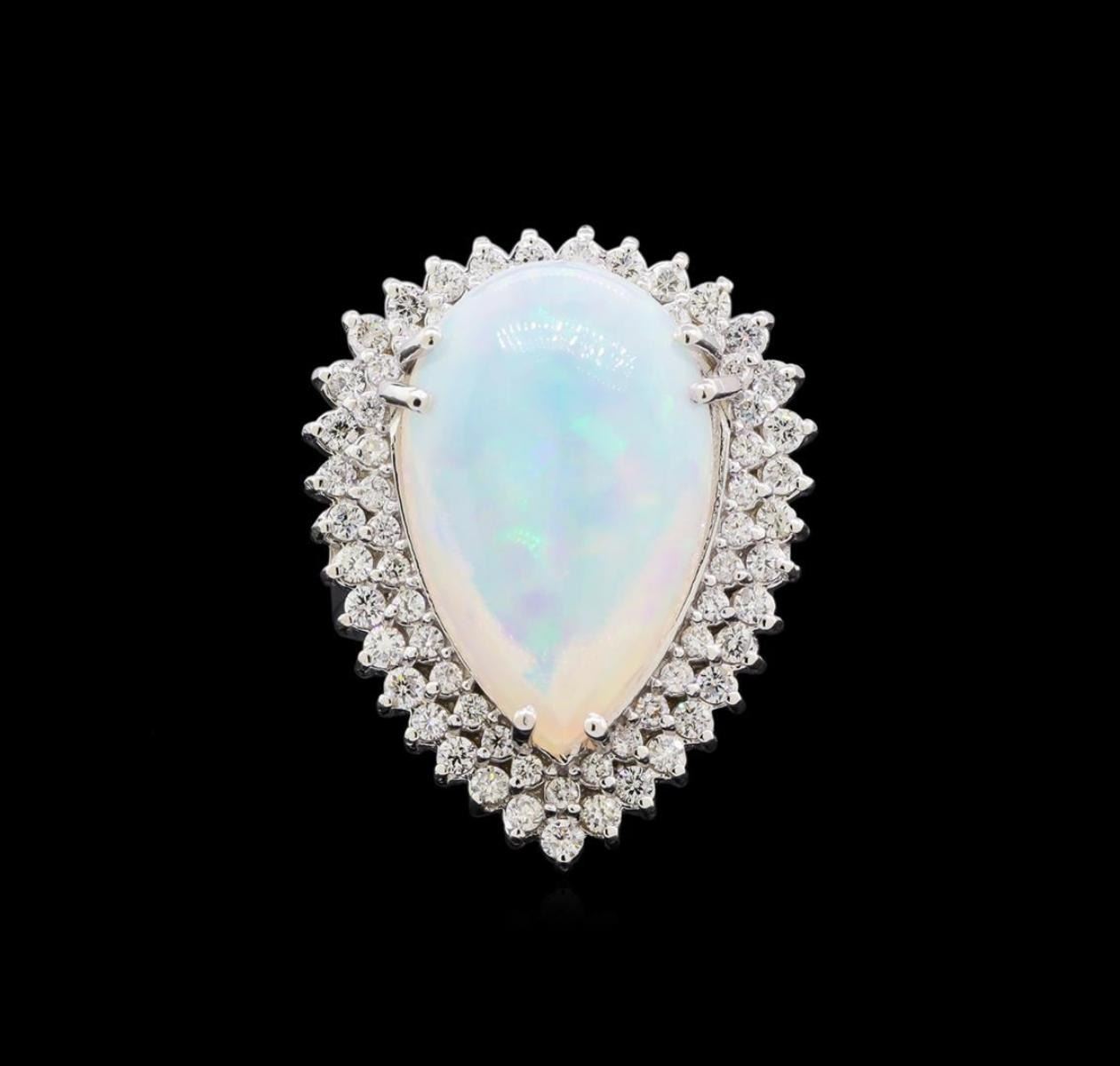 One electronically tested 14KT white gold lady's cast fashion ring with a basket double halo with a bright polish finish. The featured lady's ring has a shank measuring 3.25 millimeters in width. Identified with markings of "K14". Condition is new, good workmanship. Containing: One crystal opal that is cut in a pear shape and is prong set, measuring 21.81 mm long x 13.71 mm wide, and 6.85 mm thick and the approximate weight is 8.65 carats. The opal has a very bright, multicolor play of color (fire) in a rolling flashfire pattern; a medium dome; a good cut; no inclusions; consistent in its brightness and pattern; and is not directional. Thirty-Five prong set round brilliant cut diamonds, measuring 1.80 - 1.70 x 1.08mm (depth est.) approximate total weight of 35 Stones = 0.70ct. Graded in the setting. Clarity: VS-2 to SI-2. Color: G - Good Thirty-Four prong set round brilliant cut diamonds, measuring 1.50 - 1.40 x 0.90mm (depth est.) approximate total weight of 34 Stones = 0.42ct. Graded in the setting. Clarity: SI-1 to SI-2. Color: G - Good. Total Weight of Diamonds 1.12ct. Total Weight of Opals 8.65ct. Total Weight of Ring 12.00gm. GAS Appraised.