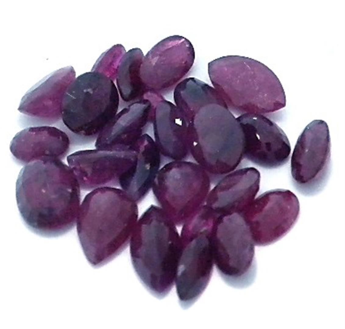 Twenty-five various shapes & sizes cut natural rubies, measuring 5.00 x 3.00 x 2.00mm, exact total weight 8.66ct., clarity is heavily included, type II, dark, very slightly brownish, slightly purplish red color, (GIA slpR 7/3), cut is good. Measurements are an average for the group. Transmitting light somewhat diffusely, transparent to translucent. Naturally occurring internal & external characteristics are present. Indications of laboratory high temperature heat treatment, with glass & flux additives. Ruby has a low tolerance to rhodium plating, repolishing the surface, & ultrasonic cleaning. Westfield Appraised at $690.00.