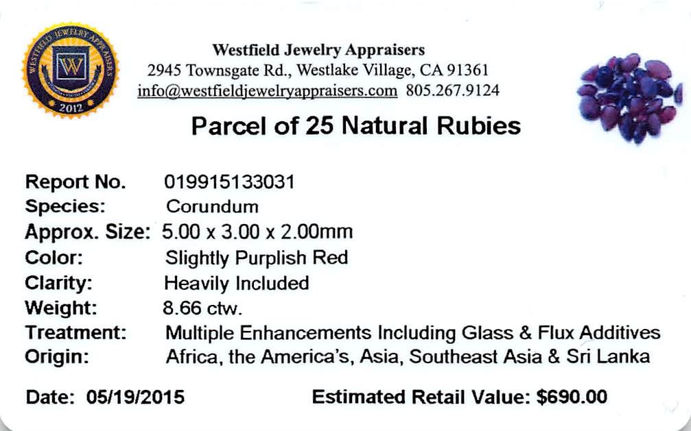 Twenty-five various shapes & sizes cut natural rubies, measuring 5.00 x 3.00 x 2.00mm, exact total weight 8.66ct., clarity is heavily included, type II, dark, very slightly brownish, slightly purplish red color, (GIA slpR 7/3), cut is good. Measurements are an average for the group. Transmitting light somewhat diffusely, transparent to translucent. Naturally occurring internal & external characteristics are present. Indications of laboratory high temperature heat treatment, with glass & flux additives. Ruby has a low tolerance to rhodium plating, repolishing the surface, & ultrasonic cleaning. Westfield Appraised at $690.00.