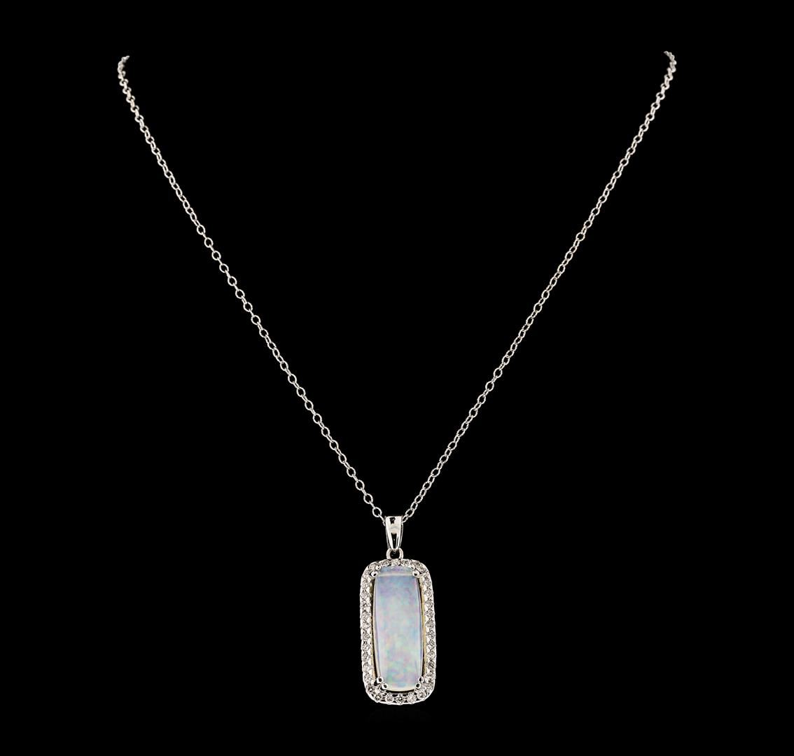 One electronically tested 14KT white gold lady's combination cast & assembled fashion pendant & chain 20.0' long, 1.9mm twisted oval shape link with a lobster claw clasp with a halo with a bright polish finish. Identified with markings of '14K'. Condition is new, good workmanship. Containing: One crystal opal that is cut in a rectangular shaped cabochon and is prong set, measuring 26.60 mm long x 10.34 mm wide, and 5.54 mm thick and the approximate weight is 8.67 carats. The opal has a somewhat bright, multicolor play of color (fire) in a rolling flashfire pattern; a medium dome; a good cut; no inclusions; consistent in its brightness and pattern; and is not directional. Graded in the setting. Thirty-Four prong set round brilliant cut diamonds, measuring 2.00 - 1.90 x 1.17mm (depth est.) approximate total weight of 34 Stones = 0.92ct. Graded in the setting. Clarity SI-1 to SI-2. Color: G - H Cut Good. Total Weight of Diamonds 0.92ct.. Total Weight of Opals 8.67ct.. Total Weight of Pendant & Chain 13.90gm. GAS Appraised at $5,810.00.