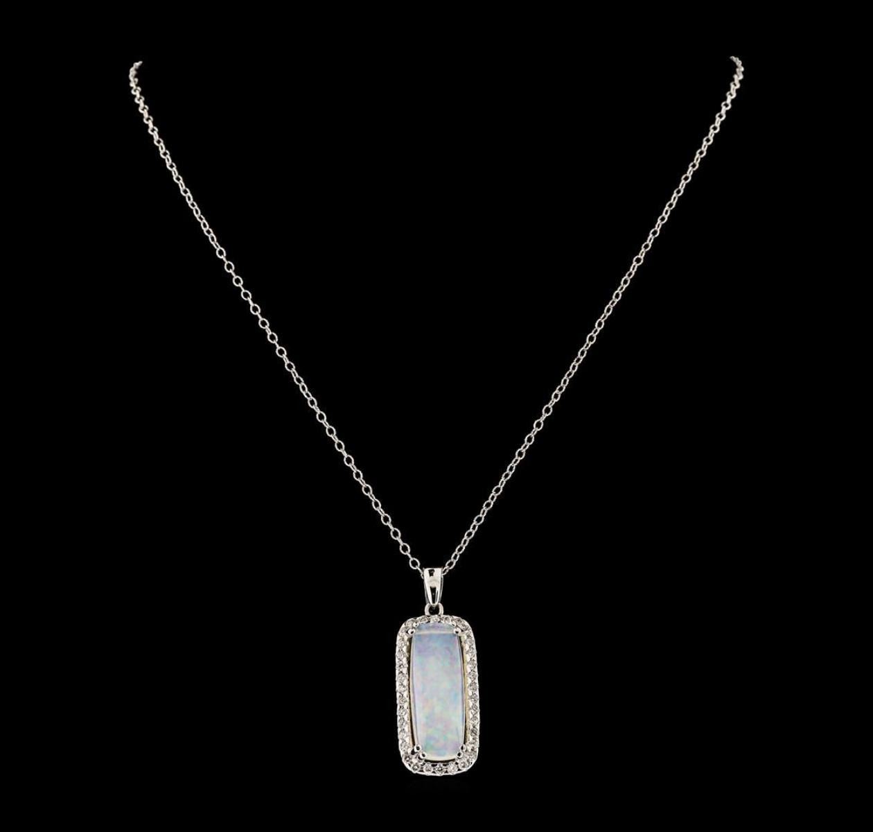 One electronically tested 14KT white gold lady's combination cast & assembled fashion pendant & chain 20.0' long, 1.9mm twisted oval shape link with a lobster claw clasp with a halo with a bright polish finish. Identified with markings of '14K'. Condition is new, good workmanship. Containing: One crystal opal that is cut in a rectangular shaped cabochon and is prong set, measuring 26.60 mm long x 10.34 mm wide, and 5.54 mm thick and the approximate weight is 8.67 carats. The opal has a somewhat bright, multicolor play of color (fire) in a rolling flashfire pattern; a medium dome; a good cut; no inclusions; consistent in its brightness and pattern; and is not directional. Graded in the setting. Thirty-Four prong set round brilliant cut diamonds, measuring 2.00 - 1.90 x 1.17mm (depth est.) approximate total weight of 34 Stones = 0.92ct. Graded in the setting. Clarity SI-1 to SI-2. Color: G - H Cut Good. Total Weight of Diamonds 0.92ct.. Total Weight of Opals 8.67ct.. Total Weight of Pendant & Chain 13.90gm. GAS Appraised.