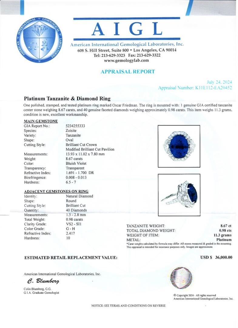 One polished, stamped, and tested platinum ring marked Oscar Friedman. The ring is mounted with: 1 genuine GIA certified tanzanite center stone weighing 8.67 carats, and 40 genuine faceted diamonds weighing approximately 0.98 carats. This item weighs 11.3 grams, condition is new, excellent workmanship. #MAIN GEMSTONE# GIA Report No.: 5234255333; Species: Zoisite; Variety: Tanzanite; Shape: Oval; Cutting Style: Brilliant Cut Crown, Modified Brilliant Cut Pavilion; Measurements: 13.93 x 11.02 x 7.80mm; Weight: 8.67 carats; Color: Bluish Violet; Transparency: Transparent; Refractive Index: 1.691 - 1.700 DR; Birefringence: 0.008 - 0.013; Hardness: 6.5 - 7 #ADJACENT GEMSTONES ON RING# Identity: Natural Diamond; Shape: Round; Cutting Style: Brilliant Cut; Quantity: 40 Diamonds; Measurements: 1.5 - 2.8mm; Total Weight: 0.98 carats; Clarity Grade: VS2-SI1; Color Grade: G-H; Refractive Index: 2.417; Hardness: 10; TANZANITE WEIGHT: 8.67 ct; TOTAL DIAMOND WEIGHT: 0.98 cts; WEIGHT OF ITEM: 11.3 grams; METAL: Platinum #Size: 6 1/2