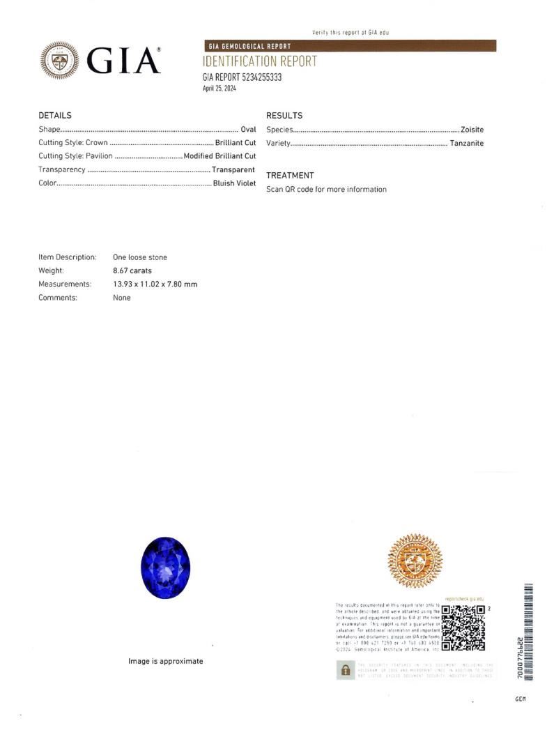 One polished, stamped, and tested platinum ring marked Oscar Friedman. The ring is mounted with: 1 genuine GIA certified tanzanite center stone weighing 8.67 carats, and 40 genuine faceted diamonds weighing approximately 0.98 carats. This item weighs 11.3 grams, condition is new, excellent workmanship. #MAIN GEMSTONE# GIA Report No.: 5234255333; Species: Zoisite; Variety: Tanzanite; Shape: Oval; Cutting Style: Brilliant Cut Crown, Modified Brilliant Cut Pavilion; Measurements: 13.93 x 11.02 x 7.80mm; Weight: 8.67 carats; Color: Bluish Violet; Transparency: Transparent; Refractive Index: 1.691 - 1.700 DR; Birefringence: 0.008 - 0.013; Hardness: 6.5 - 7 #ADJACENT GEMSTONES ON RING# Identity: Natural Diamond; Shape: Round; Cutting Style: Brilliant Cut; Quantity: 40 Diamonds; Measurements: 1.5 - 2.8mm; Total Weight: 0.98 carats; Clarity Grade: VS2-SI1; Color Grade: G-H; Refractive Index: 2.417; Hardness: 10; TANZANITE WEIGHT: 8.67 ct; TOTAL DIAMOND WEIGHT: 0.98 cts; WEIGHT OF ITEM: 11.3 grams; METAL: Platinum #Size: 6 1/2