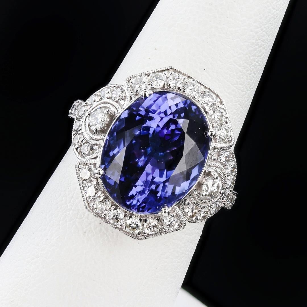 One polished, stamped, and tested platinum ring marked Oscar Friedman. The ring is mounted with: 1 genuine GIA certified tanzanite center stone weighing 8.67 carats, and 40 genuine faceted diamonds weighing approximately 0.98 carats. This item weighs 11.3 grams, condition is new, excellent workmanship. #MAIN GEMSTONE# GIA Report No.: 5234255333; Species: Zoisite; Variety: Tanzanite; Shape: Oval; Cutting Style: Brilliant Cut Crown, Modified Brilliant Cut Pavilion; Measurements: 13.93 x 11.02 x 7.80mm; Weight: 8.67 carats; Color: Bluish Violet; Transparency: Transparent; Refractive Index: 1.691 - 1.700 DR; Birefringence: 0.008 - 0.013; Hardness: 6.5 - 7 #ADJACENT GEMSTONES ON RING# Identity: Natural Diamond; Shape: Round; Cutting Style: Brilliant Cut; Quantity: 40 Diamonds; Measurements: 1.5 - 2.8mm; Total Weight: 0.98 carats; Clarity Grade: VS2-SI1; Color Grade: G-H; Refractive Index: 2.417; Hardness: 10; TANZANITE WEIGHT: 8.67 ct; TOTAL DIAMOND WEIGHT: 0.98 cts; WEIGHT OF ITEM: 11.3 grams; METAL: Platinum #Size: 6 1/2